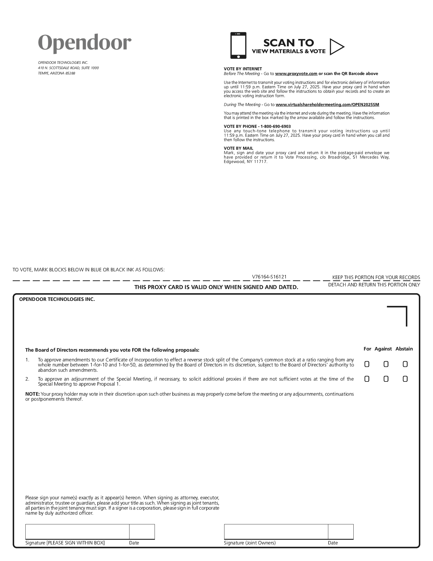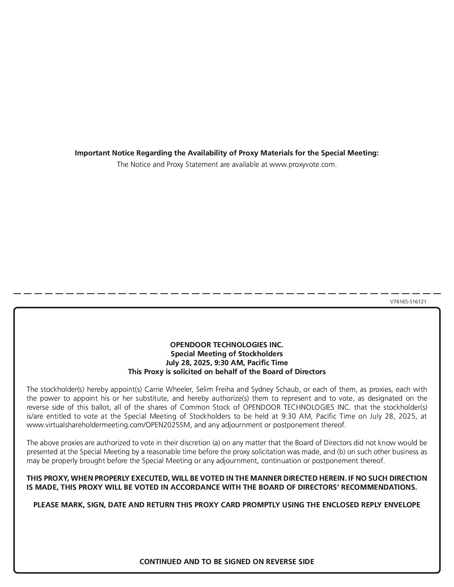 The Company maintains the Opendoor Labs Inc. 2014 Stock Plan, the Opendoor Technologies Inc. 2020 Incentive Award Plan (the “2020 Plan”), the Opendoor Technologies Inc. Amended and Restated 2020 Employee Stock Purchase Plan (“2020 ESPP”), and the Opendoor Technologies Inc. 2022 Inducement Award Plan (collectively, the “Plans”), which are designed primarily to provide stock-based incentives to employees and directors of the Company. As of June 2, 2025, options to purchase 6,984,119 shares of our Common Stock (which does not include outstanding purchase rights under our 2020 ESPP) and 52,064,842 restricted stock units were outstanding under the Plans (with performance-based restricted stock units counted based on “target” levels of performance). In the event of a Reverse Stock Split, our Board generally has the discretion to determine the appropriate adjustment to the number of shares available for future issuance, awards granted and share-based award or purchase limits under the Plans. Accordingly, if the Reverse Stock Split is approved by our stockholders and our Board decides to implement the Reverse Stock Split, as of the Effective Time (as defined below) the number of shares of Common Stock issuable upon exercise, vesting or settlement of outstanding awards, the exercise price of all outstanding options and any stock price vesting goals with respect to any outstanding awards under the Plans will be proportionately adjusted (and rounded down to the nearest whole share in the case of shares and up to the nearest whole cent in the case of exercise prices, as applicable) based on the Reverse Stock Split ratio selected by our Board, subject to the terms of such Plans, options, and restricted stock units, as applicable. In addition, the number of shares available for future issuance and any share-based award or purchase limits, as applicable, under the Plans will be proportionately reduced based on the Reverse Stock Split ratio selected by our Board.