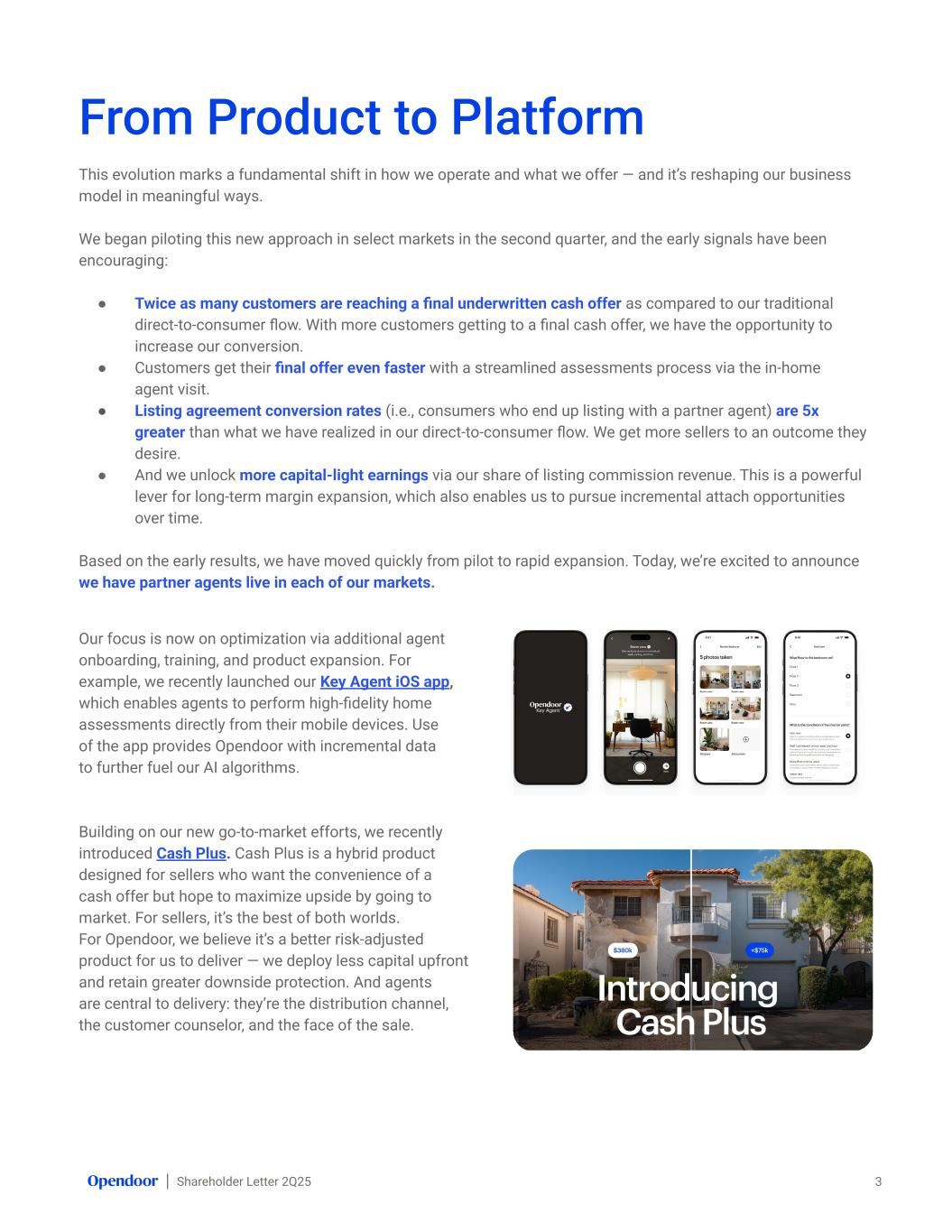 Shareholder Letter 2Q25 This evolution marks a fundamental shift in how we operate and what we offer — and it’s reshaping our business model in meaningful ways. We began piloting this new approach in select markets in the second quarter, and the early signals have been encouraging: ● Twice as many customers are reaching a final underwritten cash offer as compared to our traditional direct-to-consumer flow. With more customers getting to a final cash offer, we have the opportunity to increase our conversion. ● Customers get their final offer even faster with a streamlined assessments process via the in-home agent visit. ● Listing agreement conversion rates (i.e., consumers who end up listing with a partner agent) are 5x greater than what we have realized in our direct-to-consumer flow. We get more sellers to an outcome they desire. ● And we unlock more capital-light earnings via our share of listing commission revenue. This is a powerful lever for long-term margin expansion, which also enables us to pursue incremental attach opportunities over time. Based on the early results, we have moved quickly from pilot to rapid expansion. Today, we’re excited to announce we have partner agents live in each of our markets. From Product to Platform 3 Our focus is now on optimization via additional agent onboarding, training, and product expansion. For example, we recently launched our Key Agent iOS app, which enables agents to perform high-fidelity home assessments directly from their mobile devices. Use of the app provides Opendoor with incremental data to further fuel our AI algorithms. Building on our new go-to-market efforts, we recently introduced Cash Plus. Cash Plus is a hybrid product designed for sellers who want the convenience of a cash offer but hope to maximize upside by going to market. For sellers, it’s the best of both worlds. For Opendoor, we believe it’s a better risk-adjusted product for us to deliver — we deploy less capital upfront and retain greater downside protection. And agents are central to delivery: they’re the distribution channel, the customer counselor, and the face of the sale.