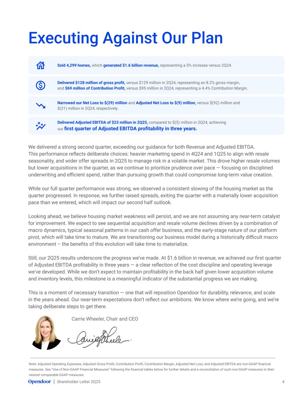 Shareholder Letter 2Q25 We delivered a strong second quarter, exceeding our guidance for both Revenue and Adjusted EBITDA. This performance reflects deliberate choices: heavier marketing spend in 4Q24 and 1Q25 to align with resale seasonality, and wider offer spreads in 2Q25 to manage risk in a volatile market. This drove higher resale volumes but lower acquisitions in the quarter, as we continue to prioritize prudence over pace — focusing on disciplined underwriting and efficient spend, rather than pursuing growth that could compromise long-term value creation. While our full quarter performance was strong, we observed a consistent slowing of the housing market as the quarter progressed. In response, we further raised spreads, exiting the quarter with a materially lower acquisition pace than we entered, which will impact our second half outlook. Looking ahead, we believe housing market weakness will persist, and we are not assuming any near-term catalyst for improvement. We expect to see sequential acquisition and resale volume declines driven by a combination of macro dynamics, typical seasonal patterns in our cash offer business, and the early-stage nature of our platform pivot, which will take time to mature. We are transitioning our business model during a historically difficult macro environment – the benefits of this evolution will take time to materialize. Still, our 2Q25 results underscore the progress we’ve made. At $1.6 billion in revenue, we achieved our first quarter of Adjusted EBITDA profitability in three years — a clear reflection of the cost discipline and operating leverage we've developed. While we don’t expect to maintain profitability in the back half given lower acquisition volume and inventory levels, this milestone is a meaningful indicator of the substantial progress we are making. This is a moment of necessary transition — one that will reposition Opendoor for durability, relevance, and scale in the years ahead. Our near-term expectations don’t reflect our ambitions. We know where we’re going, and we’re taking deliberate steps to get there. Executing Against Our Plan 4 Delivered Adjusted EBITDA of $23 million in 2Q25, compared to $(5) million in 2Q24, achieving our first quarter of Adjusted EBITDA profitability in three years. Sold 4,299 homes, which generated $1.6 billion revenue, representing a 5% increase versus 2Q24. Carrie Wheeler, Chair and CEO Delivered $128 million of gross profit, versus $129 million in 2Q24, representing an 8.2% gross margin, and $69 million of Contribution Profit, versus $95 million in 2Q24, representing a 4.4% Contribution Margin. Note: Adjusted Operating Expenses, Adjusted Gross Profit, Contribution Profit, Contribution Margin, Adjusted Net Loss, and Adjusted EBITDA are non-GAAP financial measures. See “Use of Non-GAAP Financial Measures” following the financial tables below for further details and a reconciliation of such non-GAAP measures to their nearest comparable GAAP measures. Narrowed our Net Loss to $(29) million and Adjusted Net Loss to $(9) million, versus $(92) million and $(31) million in 2Q24, respectively.