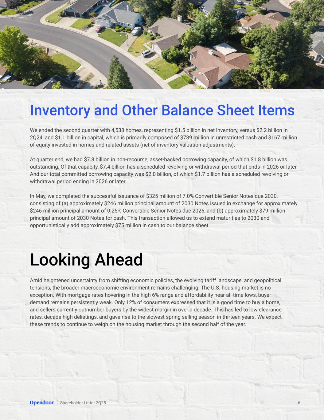Shareholder Letter 2Q25 Amid heightened uncertainty from shifting economic policies, the evolving tariff landscape, and geopolitical tensions, the broader macroeconomic environment remains challenging. The U.S. housing market is no exception. With mortgage rates hovering in the high 6% range and affordability near all-time lows, buyer demand remains persistently weak. Only 12% of consumers expressed that it is a good time to buy a home, and sellers currently outnumber buyers by the widest margin in over a decade. This has led to low clearance rates, decade high delistings, and gave rise to the slowest spring selling season in thirteen years. We expect these trends to continue to weigh on the housing market through the second half of the year. We ended the second quarter with 4,538 homes, representing $1.5 billion in net inventory, versus $2.2 billion in 2Q24, and $1.1 billion in capital, which is primarily composed of $789 million in unrestricted cash and $167 million of equity invested in homes and related assets (net of inventory valuation adjustments). At quarter end, we had $7.8 billion in non-recourse, asset-backed borrowing capacity, of which $1.8 billion was outstanding. Of that capacity, $7.4 billion has a scheduled revolving or withdrawal period that ends in 2026 or later. And our total committed borrowing capacity was $2.0 billion, of which $1.7 billion has a scheduled revolving or withdrawal period ending in 2026 or later. In May, we completed the successful issuance of $325 million of 7.0% Convertible Senior Notes due 2030, consisting of (a) approximately $246 million principal amount of 2030 Notes issued in exchange for approximately $246 million principal amount of 0.25% Convertible Senior Notes due 2026, and (b) approximately $79 million principal amount of 2030 Notes for cash. This transaction allowed us to extend maturities to 2030 and opportunistically add approximately $75 million in cash to our balance sheet. 6 Inventory and Other Balance Sheet Items Looking Ahead