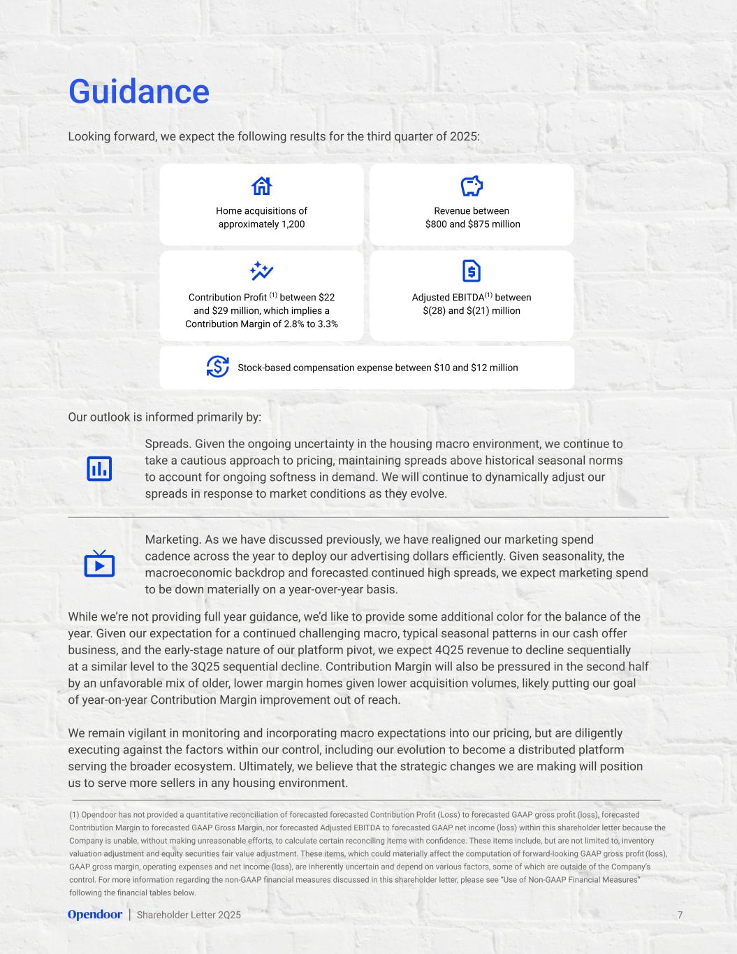Shareholder Letter 2Q25 7 Guidance (1) Opendoor has not provided a quantitative reconciliation of forecasted forecasted Contribution Profit (Loss) to forecasted GAAP gross profit (loss), forecasted Contribution Margin to forecasted GAAP Gross Margin, nor forecasted Adjusted EBITDA to forecasted GAAP net income (loss) within this shareholder letter because the Company is unable, without making unreasonable efforts, to calculate certain reconciling items with confidence. These items include, but are not limited to, inventory valuation adjustment and equity securities fair value adjustment. These items, which could materially affect the computation of forward-looking GAAP gross profit (loss), GAAP gross margin, operating expenses and net income (loss), are inherently uncertain and depend on various factors, some of which are outside of the Company’s control. For more information regarding the non-GAAP financial measures discussed in this shareholder letter, please see “Use of Non-GAAP Financial Measures” following the financial tables below. While we’re not providing full year guidance, we’d like to provide some additional color for the balance of the year. Given our expectation for a continued challenging macro, typical seasonal patterns in our cash offer business, and the early-stage nature of our platform pivot, we expect 4Q25 revenue to decline sequentially at a similar level to the 3Q25 sequential decline. Contribution Margin will also be pressured in the second half by an unfavorable mix of older, lower margin homes given lower acquisition volumes, likely putting our goal of year-on-year Contribution Margin improvement out of reach. We remain vigilant in monitoring and incorporating macro expectations into our pricing, but are diligently executing against the factors within our control, including our evolution to become a distributed platform serving the broader ecosystem. Ultimately, we believe that the strategic changes we are making will position us to serve more sellers in any housing environment. Our outlook is informed primarily by: Spreads. Given the ongoing uncertainty in the housing macro environment, we continue to take a cautious approach to pricing, maintaining spreads above historical seasonal norms to account for ongoing softness in demand. We will continue to dynamically adjust our spreads in response to market conditions as they evolve. Marketing. As we have discussed previously, we have realigned our marketing spend cadence across the year to deploy our advertising dollars efficiently. Given seasonality, the macroeconomic backdrop and forecasted continued high spreads, we expect marketing spend to be down materially on a year-over-year basis. Looking forward, we expect the following results for the third quarter of 2025: Our outlook is informed primarily by: Home acquisitions of approximately 1,200 Revenue between $800 and $875 million Contribution Profit (1) between $22 and $29 million, which implies a Contribution Margin of 2.8% to 3.3% Adjusted EBITDA(1) between $(28) and $(21) million Stock-based compensation expense between $10 and $12 million
