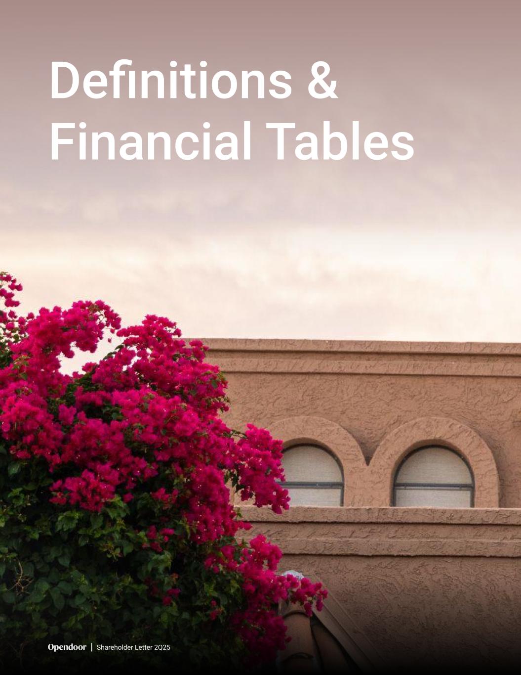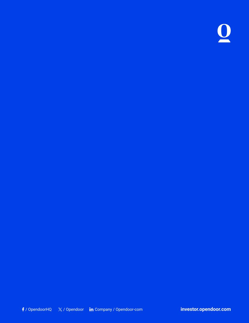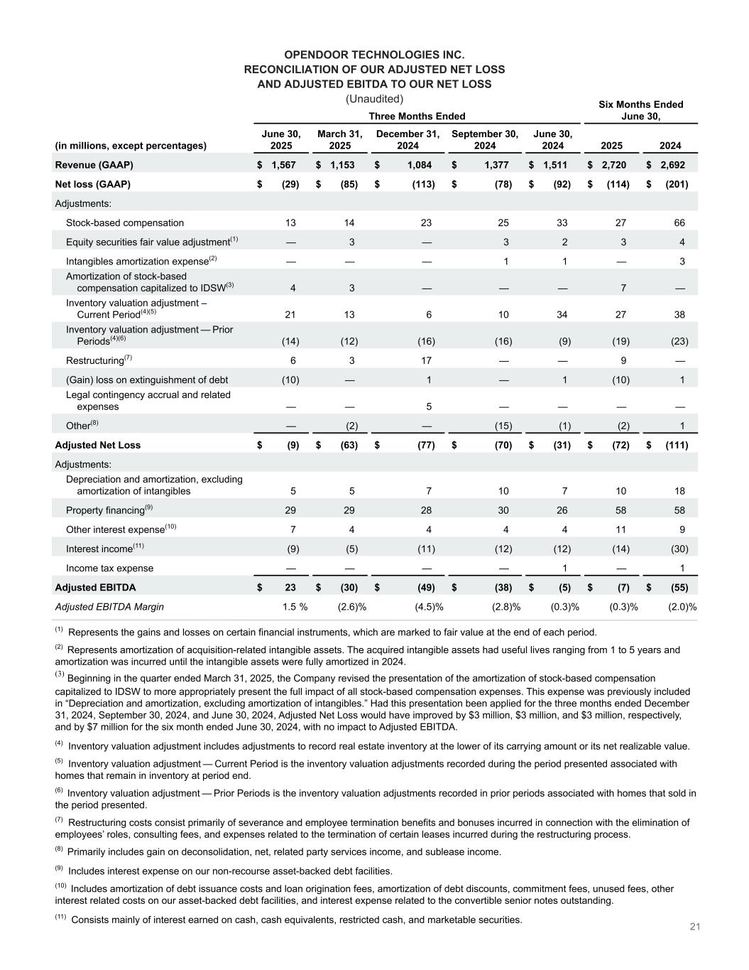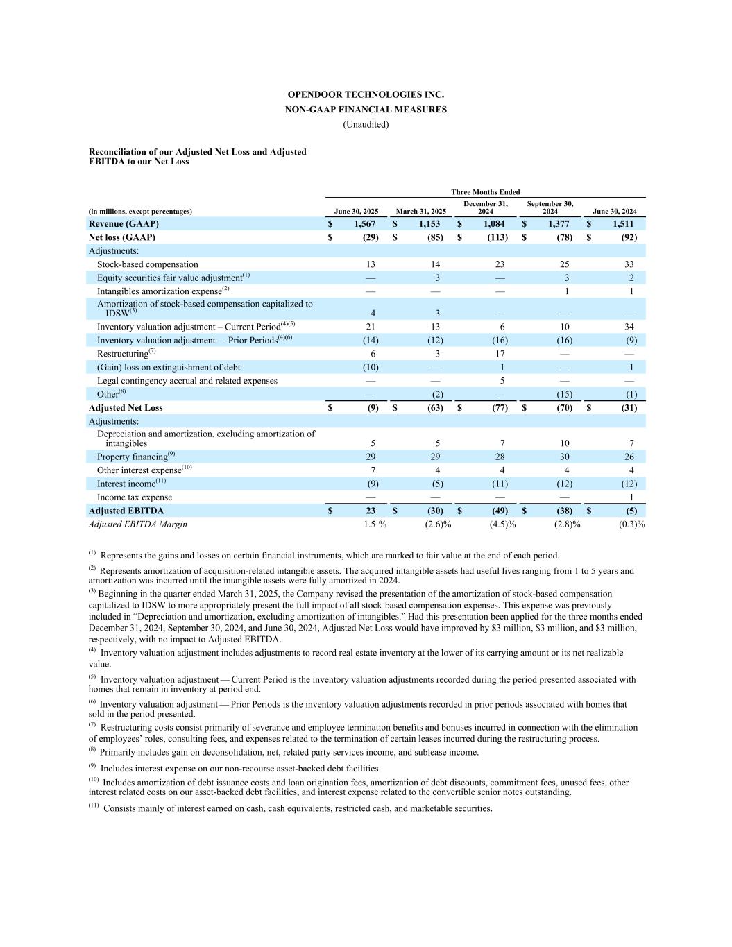 OPENDOOR TECHNOLOGIES INC. NON-GAAP FINANCIAL MEASURES (Unaudited) Reconciliation of our Adjusted Net Loss and Adjusted EBITDA to our Net Loss Three Months Ended (in millions, except percentages) June 30, 2025 March 31, 2025 December 31, 2024 September 30, 2024 June 30, 2024 Revenue (GAAP) $ 1,567 $ 1,153 $ 1,084 $ 1,377 $ 1,511 Net loss (GAAP) $ (29) $ (85) $ (113) $ (78) $ (92) Adjustments: Stock-based compensation 13 14 23 25 33 Equity securities fair value adjustment(1) — 3 — 3 2 Intangibles amortization expense(2) — — — 1 1 Amortization of stock-based compensation capitalized to IDSW(3) 4 3 — — — Inventory valuation adjustment – Current Period͏(4)(5) 21 13 6 10 34 Inventory valuation adjustment — Prior Periods͏(4)(6) (14) (12) (16) (16) (9) Restructuring(7) 6 3 17 — — (Gain) loss on extinguishment of debt (10) — 1 — 1 Legal contingency accrual and related expenses — — 5 — — Other(8) — (2) — (15) (1) Adjusted Net Loss $ (9) $ (63) $ (77) $ (70) $ (31) Adjustments: Depreciation and amortization, excluding amortization of intangibles 5 5 7 10 7 Property financing(9) 29 29 28 30 26 Other interest expense(10) 7 4 4 4 4 Interest income(11) (9) (5) (11) (12) (12) Income tax expense — — — — 1 Adjusted EBITDA $ 23 $ (30) $ (49) $ (38) $ (5) Adjusted EBITDA Margin 1.5 % (2.6) % (4.5) % (2.8) % (0.3) % (1) Represents the gains and losses on certain financial instruments, which are marked to fair value at the end of each period. (2) Represents amortization of acquisition-related intangible assets. The acquired intangible assets had useful lives ranging from 1 to 5 years and amortization was incurred until the intangible assets were fully amortized in 2024. (3) Beginning in the quarter ended March 31, 2025, the Company revised the presentation of the amortization of stock-based compensation capitalized to IDSW to more appropriately present the full impact of all stock-based compensation expenses. This expense was previously included in “Depreciation and amortization, excluding amortization of intangibles.” Had this presentation been applied for the three months ended December 31, 2024, September 30, 2024, and June 30, 2024, Adjusted Net Loss would have improved by $3 million, $3 million, and $3 million, respectively, with no impact to Adjusted EBITDA. (4) Inventory valuation adjustment includes adjustments to record real estate inventory at the lower of its carrying amount or its net realizable value. (5) Inventory valuation adjustment — Current Period is the inventory valuation adjustments recorded during the period presented associated with homes that remain in inventory at period end. (6) Inventory valuation adjustment — Prior Periods is the inventory valuation adjustments recorded in prior periods associated with homes that sold in the period presented. (7) Restructuring costs consist primarily of severance and employee termination benefits and bonuses incurred in connection with the elimination of employees’ roles, consulting fees, and expenses related to the termination of certain leases incurred during the restructuring process. (8) Primarily includes gain on deconsolidation, net, related party services income, and sublease income. (9) Includes interest expense on our non-recourse asset-backed debt facilities. (10) Includes amortization of debt issuance costs and loan origination fees, amortization of debt discounts, commitment fees, unused fees, other interest related costs on our asset-backed debt facilities, and interest expense related to the convertible senior notes outstanding. (11) Consists mainly of interest earned on cash, cash equivalents, restricted cash, and marketable securities.