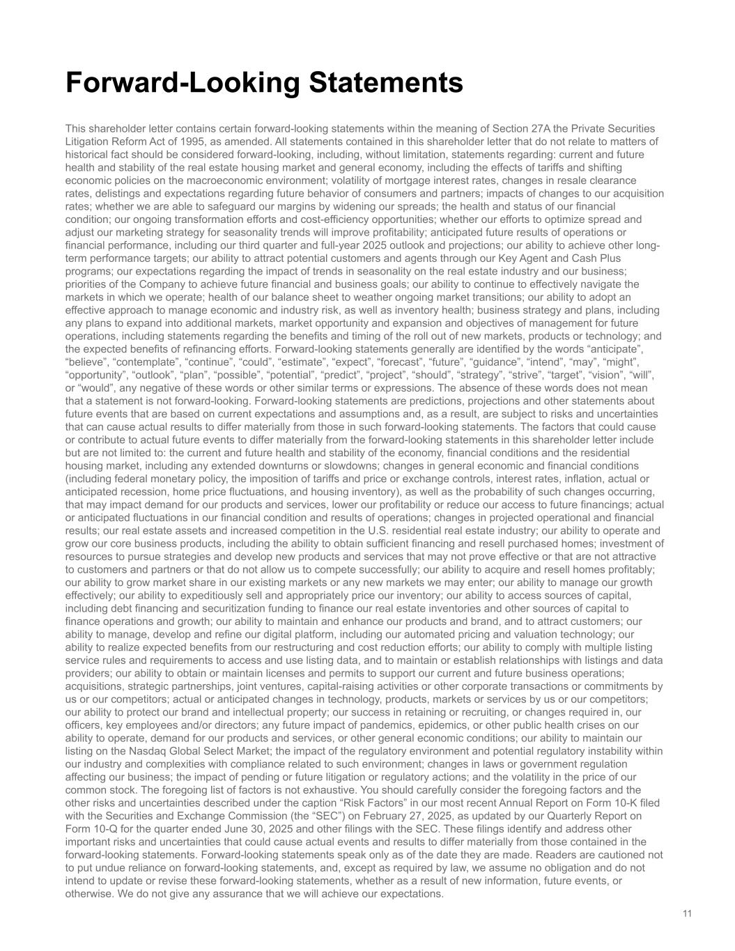 changes in general economic and financial conditions (including federal monetary policy, the imposition of tariffs and price or exchange controls, interest rates, inflation, actual or anticipated recession, home price fluctuations, and housing inventory), as well as the probability of such changes occurring, that impact demand for our products and services, lower our profitability or reduce our access to future financings; actual or anticipated fluctuations in our financial condition and results of operations; changes in projected operational and financial results; our real estate assets and increased competition in the U.S. residential real estate industry; our ability to operate and grow our core business products, including the ability to obtain sufficient financing and resell purchased homes; investment of resources to pursue strategies and develop new products and services that may not prove effective or that are not attractive to customers and/or partners or that do not allow us to compete successfully; our ability to acquire and resell homes profitably; our ability to grow market share in our existing markets or any new markets we may enter; our ability to manage our growth effectively; our ability to expeditiously sell and appropriately price our inventory; our ability to access sources of capital, including debt financing and securitization funding to finance our real estate inventories and other sources of capital to finance operations and growth; our ability to maintain and enhance our products and brand, and to attract customers; our ability to manage, develop and refine our digital platform, including our automated pricing and valuation technology; our ability to realize expected benefits from our restructuring and cost reduction efforts; our ability to comply with multiple listing service rules and requirements to access and use listing data, and to maintain or establish relationships with listings and data providers; our ability to obtain or maintain licenses and permits to support our current and future business operations; acquisitions, strategic partnerships, joint ventures, capital-raising activities or other corporate transactions or commitments by us or our competitors; actual or anticipated changes in technology, products, markets or services by us or our competitors; our ability to protect our brand and intellectual property; our success in retaining or recruiting, or changes required in, our officers, key employees and/or directors; the impact of the regulatory environment and potential regulatory instability within our industry and complexities with compliance related to such environment; any future impact of pandemics, epidemics, or other public health crises on our ability to operate, demand for our products and services, or general economic conditions; our ability to maintain our listing on the Nasdaq Global Select Market; changes in laws or government regulation affecting our business; the impact of pending or future litigation or regulatory actions; and the volatility in the price of our common stock. The foregoing list of factors is not exhaustive. You should carefully consider the foregoing factors and the other risks and uncertainties described under the caption “Risk Factors” in our most recent Annual Report on Form 10-K filed with the Securities and Exchange Commission (the “SEC”) on February 27, 2025, as updated by our Quarterly Report on Form 10-Q for the quarter ended June 30, 2025 and other filings with the SEC. These filings identify and address other important risks and uncertainties that could cause actual events and results to differ materially from those contained in the forward-looking statements. Forward-looking statements speak only as of the date they are made. Readers are cautioned not to put undue reliance on forward-looking statements, and, except as required by law, we assume no obligation and do not intend to update or revise these forward-looking statements, whether as a result of new information, future events, or otherwise. We do not give any assurance that we will achieve our expectations.