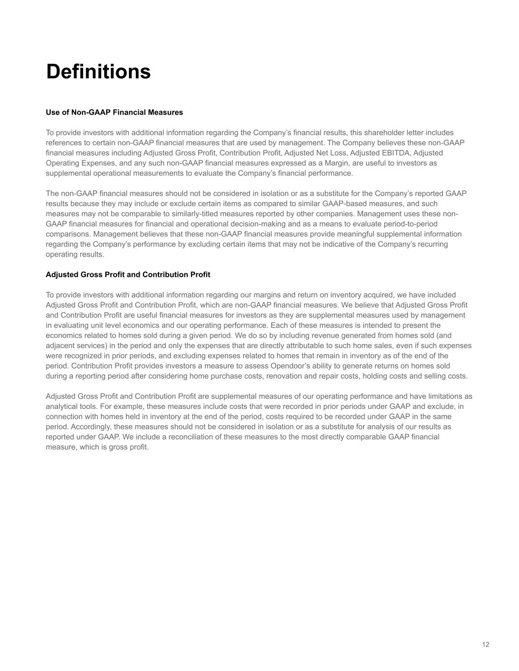 Use of Non-GAAP Financial Measures To provide investors with additional information regarding the Company’s financial results, this shareholder letter includes references to certain non-GAAP financial measures that are used by management. The Company believes these non-GAAP financial measures including Adjusted Gross Profit, Contribution Profit, Adjusted Net Loss, Adjusted EBITDA, Adjusted Operating Expenses, and any such non-GAAP financial measures expressed as a Margin, are useful to investors as supplemental operational measurements to evaluate the Company’s financial performance. The non-GAAP financial measures should not be considered in isolation or as a substitute for the Company’s reported GAAP results because they may include or exclude certain items as compared to similar GAAP-based measures, and such measures may not be comparable to similarly-titled measures reported by other companies. Management uses these non- GAAP financial measures for financial and operational decision-making and as a means to evaluate period-to-period comparisons. Management believes that these non-GAAP financial measures provide meaningful supplemental information regarding the Company’s performance by excluding certain items that may not be indicative of the Company’s recurring operating results. Adjusted Gross Profit and Contribution Profit To provide investors with additional information regarding our margins and return on inventory acquired, we have included Adjusted Gross Profit and Contribution Profit, which are non-GAAP financial measures. We believe that Adjusted Gross Profit and Contribution Profit are useful financial measures for investors as they are supplemental measures used by management in evaluating unit level economics and our operating performance. Each of these measures is intended to present the economics related to homes sold during a given period. We do so by including revenue generated from homes sold (and adjacent services) in the period and only the expenses that are directly attributable to such home sales, even if such expenses were recognized in prior periods, and excluding expenses related to homes that remain in inventory as of the end of the period. Contribution Profit provides investors a measure to assess Opendoor’s ability to generate returns on homes sold during a reporting period after considering home purchase costs, renovation and repair costs, holding costs and selling costs. Adjusted Gross Profit and Contribution Profit are supplemental measures of our operating performance and have limitations as analytical tools. For example, these measures include costs that were recorded in prior periods under GAAP and exclude, in connection with homes held in inventory at the end of the period, costs required to be recorded under GAAP in the same period. Accordingly, these measures should not be considered in isolation or as a substitute for analysis of our results as reported under GAAP. We include a reconciliation of these measures to the most directly comparable GAAP financial measure, which is gross profit. 12 Definitions