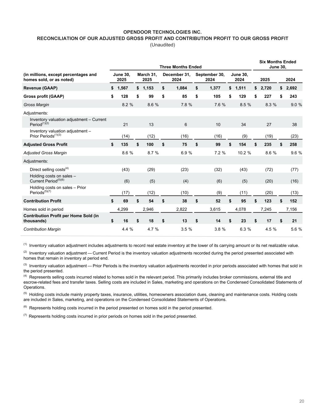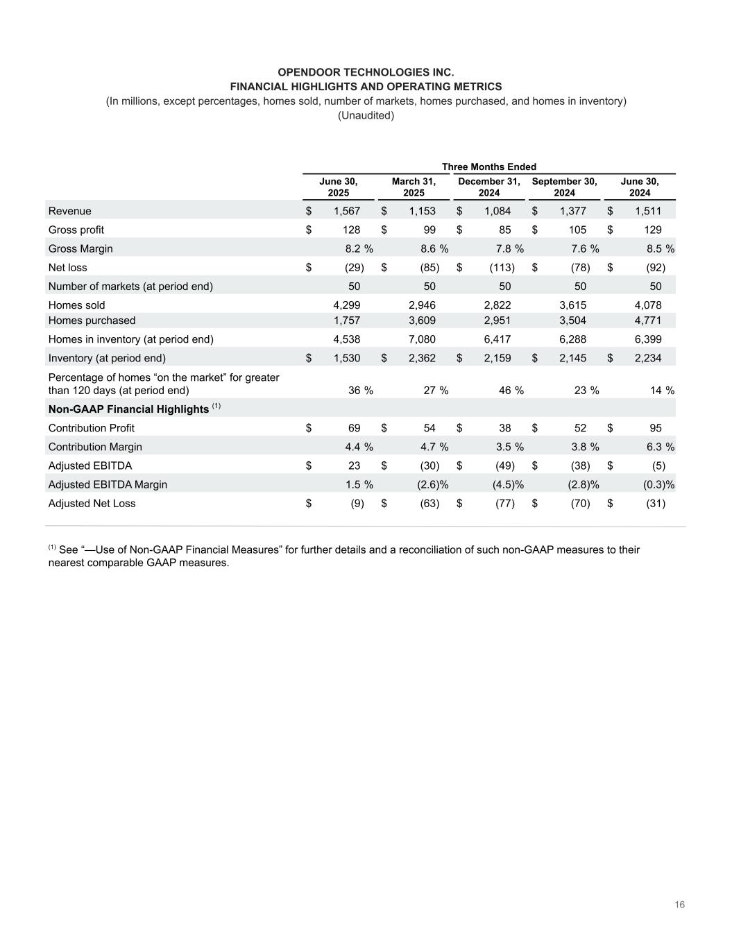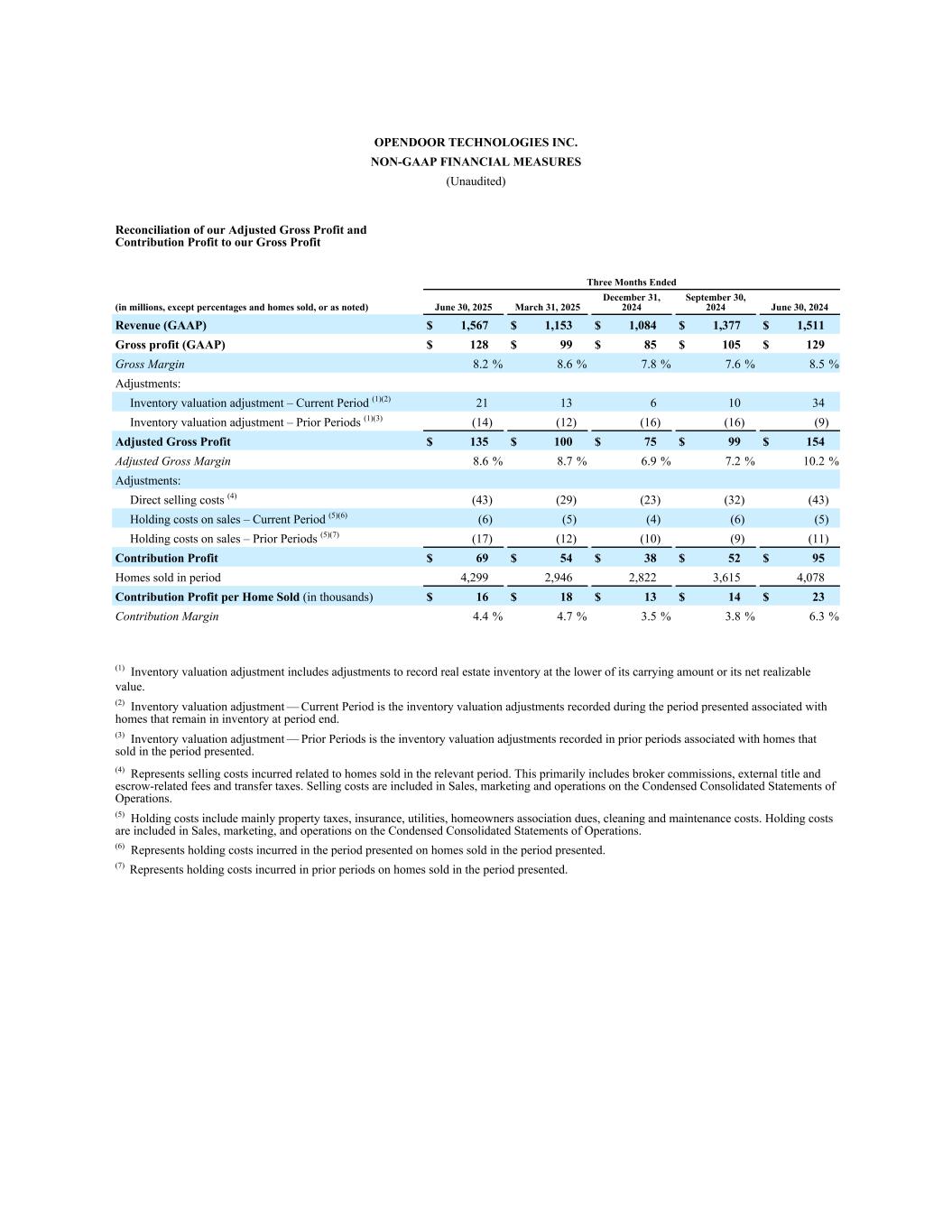 OPENDOOR TECHNOLOGIES INC. NON-GAAP FINANCIAL MEASURES (Unaudited) Reconciliation of our Adjusted Gross Profit and Contribution Profit to our Gross Profit Three Months Ended (in millions, except percentages and homes sold, or as noted) June 30, 2025 March 31, 2025 December 31, 2024 September 30, 2024 June 30, 2024 Revenue (GAAP) $ 1,567 $ 1,153 $ 1,084 $ 1,377 $ 1,511 Gross profit (GAAP) $ 128 $ 99 $ 85 $ 105 $ 129 Gross Margin 8.2 % 8.6 % 7.8 % 7.6 % 8.5 % Adjustments: Inventory valuation adjustment – Current Period͏ (1)(2) 21 13 6 10 34 Inventory valuation adjustment – Prior Periods͏ (1)(3) (14) (12) (16) (16) (9) Adjusted Gross Profit $ 135 $ 100 $ 75 $ 99 $ 154 Adjusted Gross Margin 8.6 % 8.7 % 6.9 % 7.2 % 10.2 % Adjustments: Direct selling costs (4) (43) (29) (23) (32) (43) Holding costs on sales – Current Period͏ (5)(6) (6) (5) (4) (6) (5) Holding costs on sales – Prior Periods͏ (5)(7) (17) (12) (10) (9) (11) Contribution Profit $ 69 $ 54 $ 38 $ 52 $ 95 Homes sold in period 4,299 2,946 2,822 3,615 4,078 Contribution Profit per Home Sold (in thousands) $ 16 $ 18 $ 13 $ 14 $ 23 Contribution Margin 4.4 % 4.7 % 3.5 % 3.8 % 6.3 % (1) Inventory valuation adjustment includes adjustments to record real estate inventory at the lower of its carrying amount or its net realizable value. (2) Inventory valuation adjustment — Current Period is the inventory valuation adjustments recorded during the period presented associated with homes that remain in inventory at period end. (3) Inventory valuation adjustment — Prior Periods is the inventory valuation adjustments recorded in prior periods associated with homes that sold in the period presented. (4) Represents selling costs incurred related to homes sold in the relevant period. This primarily includes broker commissions, external title and escrow-related fees and transfer taxes. Selling costs are included in Sales, marketing and operations on the Condensed Consolidated Statements of Operations. (5) Holding costs include mainly property taxes, insurance, utilities, homeowners association dues, cleaning and maintenance costs. Holding costs are included in Sales, marketing, and operations on the Condensed Consolidated Statements of Operations. (6) Represents holding costs incurred in the period presented on homes sold in the period presented. (7) Represents holding costs incurred in prior periods on homes sold in the period presented.