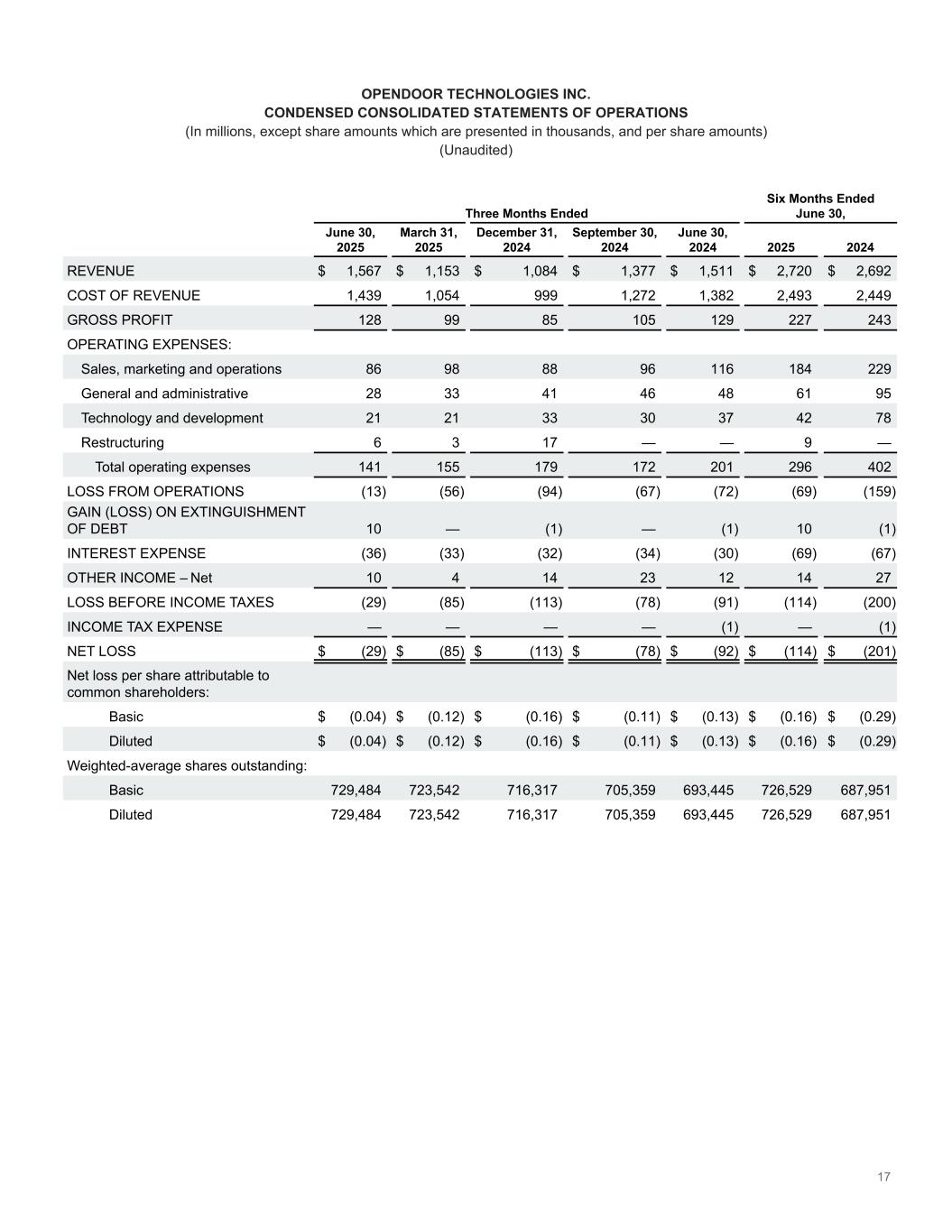 17 Three Months Ended Six Months Ended June 30, June 30, 2025 March 31, 2025 December 31, 2024 September 30, 2024 June 30, 2024 2025 2024 REVENUE $ 1,567 $ 1,153 $ 1,084 $ 1,377 $ 1,511 $ 2,720 $ 2,692 COST OF REVENUE 1,439 1,054 999 1,272 1,382 2,493 2,449 GROSS PROFIT 128 99 85 105 129 227 243 OPERATING EXPENSES: Sales, marketing and operations 86 98 88 96 116 184 229 General and administrative 28 33 41 46 48 61 95 Technology and development 21 21 33 30 37 42 78 Restructuring 6 3 17 — — 9 — Total operating expenses 141 155 179 172 201 296 402 LOSS FROM OPERATIONS (13) (56) (94) (67) (72) (69) (159) GAIN (LOSS) ON EXTINGUISHMENT OF DEBT 10 — (1) — (1) 10 (1) INTEREST EXPENSE (36) (33) (32) (34) (30) (69) (67) OTHER INCOME – Net 10 4 14 23 12 14 27 LOSS BEFORE INCOME TAXES (29) (85) (113) (78) (91) (114) (200) INCOME TAX EXPENSE — — — — (1) — (1) NET LOSS $ (29) $ (85) $ (113) $ (78) $ (92) $ (114) $ (201) Net loss per share attributable to common shareholders: Basic $ (0.04) $ (0.12) $ (0.16) $ (0.11) $ (0.13) $ (0.16) $ (0.29) Diluted $ (0.04) $ (0.12) $ (0.16) $ (0.11) $ (0.13) $ (0.16) $ (0.29) Weighted-average shares outstanding: Basic 729,484 723,542 716,317 705,359 693,445 726,529 687,951 Diluted 729,484 723,542 716,317 705,359 693,445 726,529 687,951 OPENDOOR TECHNOLOGIES INC. CONDENSED CONSOLIDATED STATEMENTS OF OPERATIONS (In millions, except share amounts which are presented in thousands, and per share amounts) (Unaudited)