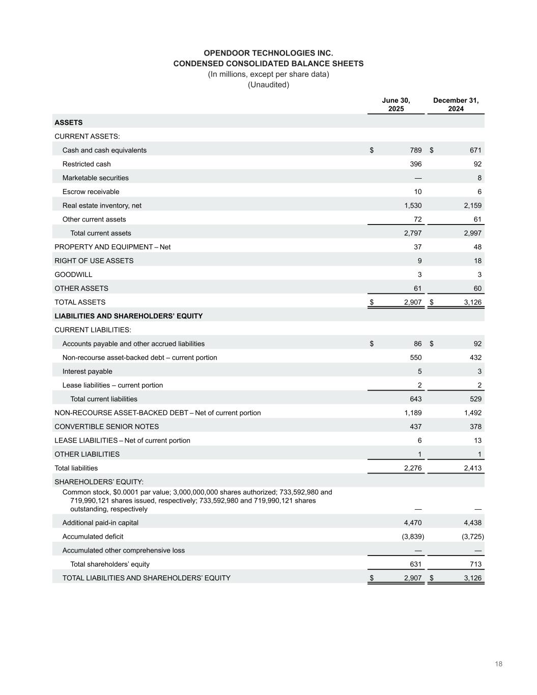 OPENDOOR TECHNOLOGIES INC. CONDENSED CONSOLIDATED BALANCE SHEETS (In millions, except share data) (Unaudited) June 30, 2025 December 31, 2024 ASSETS CURRENT ASSETS: Cash and cash equivalents $ 789 $ 671 Restricted cash 396 92 Marketable securities — 8 Escrow receivable 10 6 Real estate inventory, net 1,530 2,159 Other current assets 72 61 Total current assets 2,797 2,997 PROPERTY AND EQUIPMENT – Net 37 48 RIGHT OF USE ASSETS 9 18 GOODWILL 3 3 OTHER ASSETS 61 60 TOTAL ASSETS $ 2,907 $ 3,126 LIABILITIES AND SHAREHOLDERS’ EQUITY CURRENT LIABILITIES: Accounts payable and other accrued liabilities $ 86 $ 92 Non-recourse asset-backed debt – current portion 550 432 Interest payable 5 3 Lease liabilities – current portion 2 2 Total current liabilities 643 529 NON-RECOURSE ASSET-BACKED DEBT – Net of current portion 1,189 1,492 CONVERTIBLE SENIOR NOTES 437 378 LEASE LIABILITIES – Net of current portion 6 13 OTHER LIABILITIES 1 1 Total liabilities 2,276 2,413 SHAREHOLDERS’ EQUITY: Common stock, $0.0001 par value; 3,000,000,000 shares authorized; 733,592,980 and 719,990,121 shares issued, respectively; 733,592,980 and 719,990,121 shares outstanding, respectively — — Additional paid-in capital 4,470 4,438 Accumulated deficit (3,839) (3,725) Accumulated other comprehensive loss — — Total shareholders’ equity 631 713 TOTAL LIABILITIES AND SHAREHOLDERS’ EQUITY $ 2,907 $ 3,126