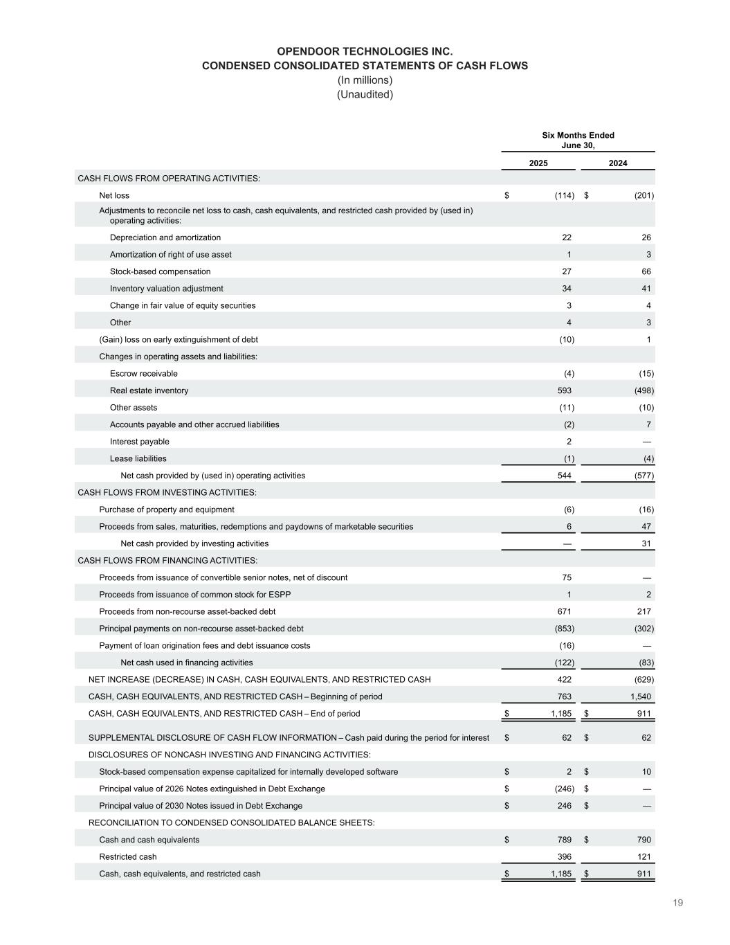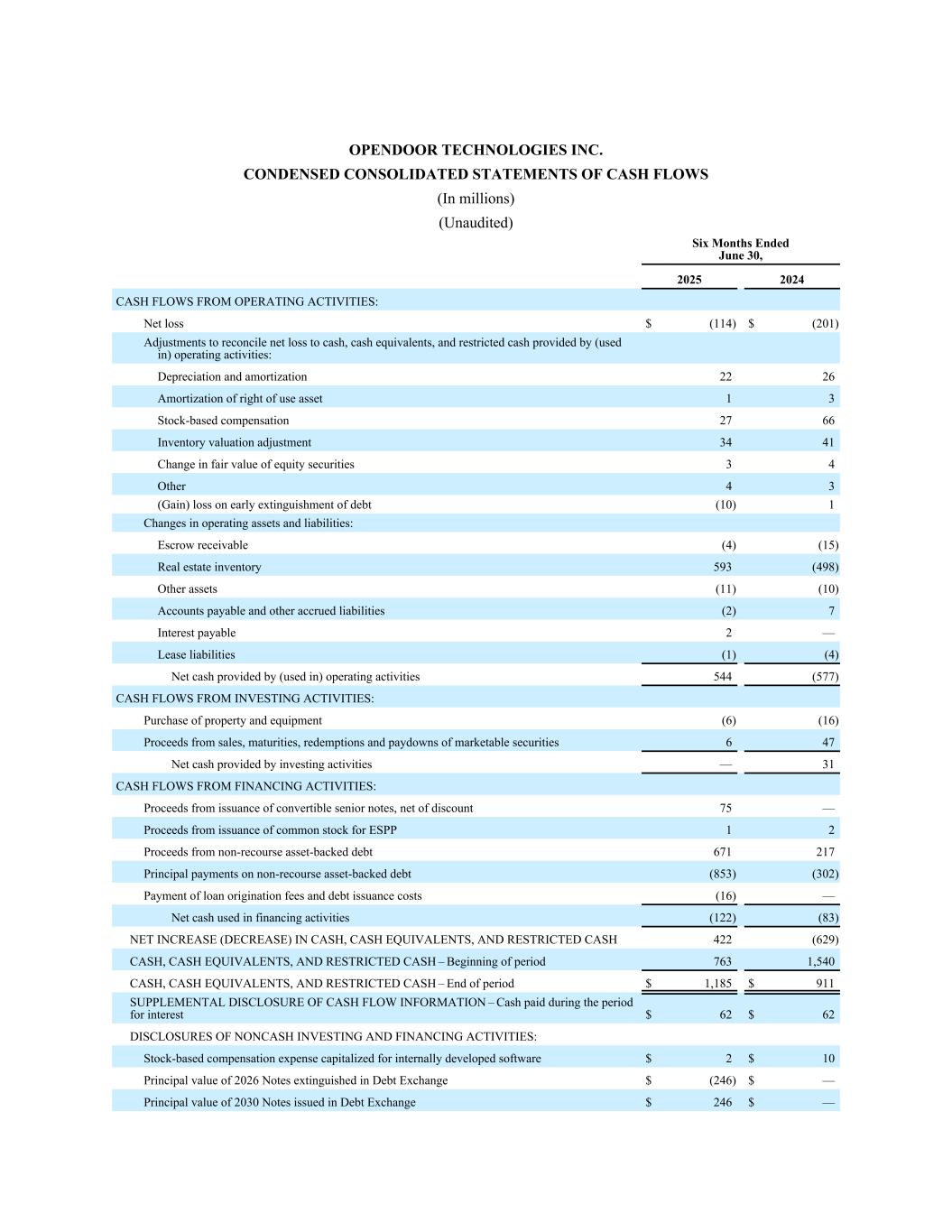 OPENDOOR TECHNOLOGIES INC. CONDENSED CONSOLIDATED STATEMENTS OF CASH FLOWS (In millions) (Unaudited) Six Months Ended June 30, 2025 2024 CASH FLOWS FROM OPERATING ACTIVITIES: Net loss $ (114) $ (201) Adjustments to reconcile net loss to cash, cash equivalents, and restricted cash provided by (used in) operating activities: Depreciation and amortization 22 26 Amortization of right of use asset 1 3 Stock-based compensation 27 66 Inventory valuation adjustment 34 41 Change in fair value of equity securities 3 4 Other 4 3 (Gain) loss on early extinguishment of debt (10) 1 Changes in operating assets and liabilities: Escrow receivable (4) (15) Real estate inventory 593 (498) Other assets (11) (10) Accounts payable and other accrued liabilities (2) 7 Interest payable 2 — Lease liabilities (1) (4) Net cash provided by (used in) operating activities 544 (577) CASH FLOWS FROM INVESTING ACTIVITIES: Purchase of property and equipment (6) (16) Proceeds from sales, maturities, redemptions and paydowns of marketable securities 6 47 Net cash provided by investing activities — 31 CASH FLOWS FROM FINANCING ACTIVITIES: Proceeds from issuance of convertible senior notes, net of discount 75 — Proceeds from issuance of common stock for ESPP 1 2 Proceeds from non-recourse asset-backed debt 671 217 Principal payments on non-recourse asset-backed debt (853) (302) Payment of loan origination fees and debt issuance costs (16) — Net cash used in financing activities (122) (83) NET INCREASE (DECREASE) IN CASH, CASH EQUIVALENTS, AND RESTRICTED CASH 422 (629) CASH, CASH EQUIVALENTS, AND RESTRICTED CASH – Beginning of period 763 1,540 CASH, CASH EQUIVALENTS, AND RESTRICTED CASH – End of period $ 1,185 $ 911 SUPPLEMENTAL DISCLOSURE OF CASH FLOW INFORMATION – Cash paid during the period for interest $ 62 $ 62 DISCLOSURES OF NONCASH INVESTING AND FINANCING ACTIVITIES: Stock-based compensation expense capitalized for internally developed software $ 2 $ 10 Principal value of 2026 Notes extinguished in Debt Exchange $ (246) $ — Principal value of 2030 Notes issued in Debt Exchange $ 246 $ —