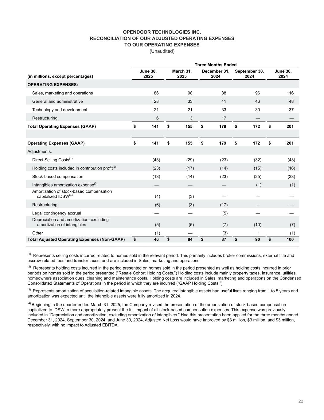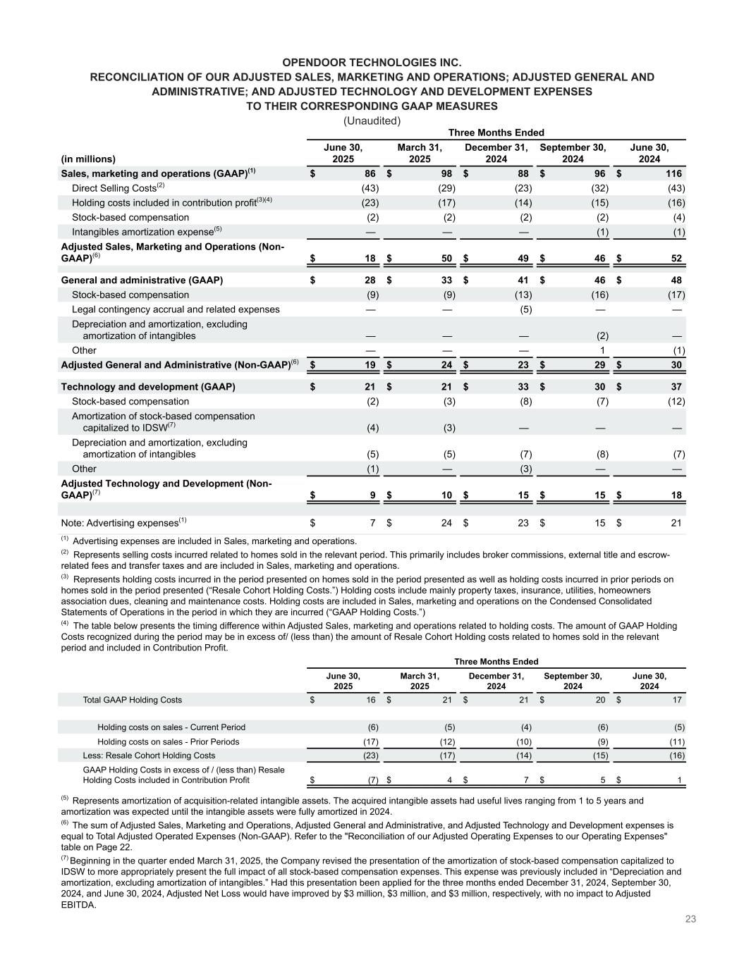 23 OPENDOOR TECHNOLOGIES INC. RECONCILIATION OF OUR ADJUSTED SALES, MARKETING AND OPERATIONS; ADJUSTED GENERAL AND ADMINISTRATIVE; AND ADJUSTED TECHNOLOGY AND DEVELOPMENT EXPENSES TO THEIR CORRESPONDING GAAP MEASURES (Unaudited) Three Months Ended (in millions) June 30, 2025 March 31, 2025 December 31, 2024 September 30, 2024 June 30, 2024 Sales, marketing and operations (GAAP)(1) $ 86 $ 98 $ 88 $ 96 $ 116 Direct Selling Costs(2) (43) (29) (23) (32) (43) Holding costs included in contribution profit(3)(4) (23) (17) (14) (15) (16) Stock-based compensation (2) (2) (2) (2) (4) Intangibles amortization expense(5) — — — (1) (1) Adjusted Sales, Marketing and Operations (Non- GAAP)(6) $ 18 $ 50 $ 49 $ 46 $ 52 General and administrative (GAAP) $ 28 $ 33 $ 41 $ 46 $ 48 Stock-based compensation (9) (9) (13) (16) (17) Legal contingency accrual and related expenses — — (5) — — Depreciation and amortization, excluding amortization of intangibles — — — (2) — Other — — — 1 (1) Adjusted General and Administrative (Non-GAAP)(6) $ 19 $ 24 $ 23 $ 29 $ 30 Technology and development (GAAP) $ 21 $ 21 $ 33 $ 30 $ 37 Stock-based compensation (2) (3) (8) (7) (12) Amortization of stock-based compensation capitalized to IDSW(7) (4) (3) — — — Depreciation and amortization, excluding amortization of intangibles (5) (5) (7) (8) (7) Other (1) — (3) — — Adjusted Technology and Development (Non- GAAP)(7) $ 9 $ 10 $ 15 $ 15 $ 18 Note: Advertising expenses(1) $ 7 $ 24 $ 23 $ 15 $ 21 (1) Advertising expenses are included in Sales, marketing and operations. (2) Represents selling costs incurred related to homes sold in the relevant period. This primarily includes broker commissions, external title and escrow- related fees and transfer taxes and are included in Sales, marketing and operations. (3) Represents holding costs incurred in the period presented on homes sold in the period presented as well as holding costs incurred in prior periods on homes sold in the period presented (“Resale Cohort Holding Costs.”) Holding costs include mainly property taxes, insurance, utilities, homeowners association dues, cleaning and maintenance costs. Holding costs are included in Sales, marketing and operations on the Condensed Consolidated Statements of Operations in the period in which they are incurred (“GAAP Holding Costs.”) (4) The table below presents the timing difference within Adjusted Sales, marketing and operations related to holding costs. The amount of GAAP Holding Costs recognized during the period may be in excess of/ (less than) the amount of Resale Cohort Holding costs related to homes sold in the relevant period and included in Contribution Profit. Three Months Ended June 30, 2025 March 31, 2025 December 31, 2024 September 30, 2024 June 30, 2024 Total GAAP Holding Costs $ 16 $ 21 $ 21 $ 20 $ 17 Holding costs on sales - Current Period (6) (5) (4) (6) (5) Holding costs on sales - Prior Periods (17) (12) (10) (9) (11) Less: Resale Cohort Holding Costs (23) (17) (14) (15) (16) GAAP Holding Costs in excess of / (less than) Resale Holding Costs included in Contribution Profit $ (7) $ 4 $ 7 $ 5 $ 1 (5) Represents amortization of acquisition-related intangible assets. The acquired intangible assets had useful lives ranging from 1 to 5 years and amortization was expected until the intangible assets were fully amortized in 2024. (6) The sum of Adjusted Sales, Marketing and Operations, Adjusted General and Administrative, and Adjusted Technology and Development expenses is equal to Total Adjusted Operated Expenses (Non-GAAP). Refer to the "Reconciliation of our Adjusted Operating Expenses to our Operating Expenses" table on Page 22. (7) Beginning in the quarter ended March 31, 2025, the Company revised the presentation of the amortization of stock-based compensation capitalized to IDSW to more appropriately present the full impact of all stock-based compensation expenses. This expense was previously included in “Depreciation and amortization, excluding amortization of intangibles.” Had this presentation been applied for the three months ended December 31, 2024, September 30, 2024, and June 30, 2024, Adjusted Net Loss would have improved by $3 million, $3 million, and $3 million, respectively, with no impact to Adjusted EBITDA.
