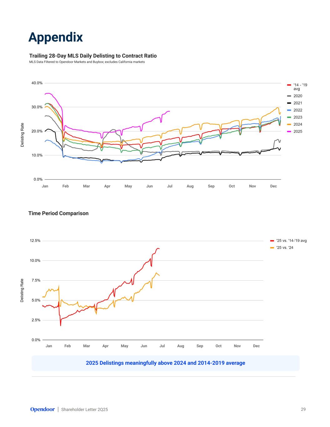 Shareholder Letter 2Q25 Jan Feb Mar Apr May Jun Jul Aug Sep Oct Nov Dec Jan Feb Mar Apr May Jun l ec Appendix Trailing 28-Day MLS Daily Delisting to Contract Ratio MLS Data Filtered to Opendoor Markets and Buybox; excludes California markets 29 Time Period Comparison Jan Feb Mar Apr May Jun Jul Aug Sep Oct Nov Dec 2025 Delistings meaningfully above 2024 and 2014-2019 average