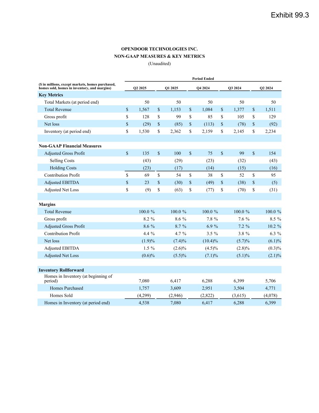 OPENDOOR TECHNOLOGIES INC. NON-GAAP MEASURES & KEY METRICS (Unaudited) Period Ended ($ in millions, except markets, homes purchased, homes sold, homes in inventory, and margins) Q2 2025 Q1 2025 Q4 2024 Q3 2024 Q2 2024 Key Metrics Total Markets (at period end) 50 50 50 50 50 Total Revenue $ 1,567 $ 1,153 $ 1,084 $ 1,377 $ 1,511 Gross profit $ 128 $ 99 $ 85 $ 105 $ 129 Net loss $ (29) $ (85) $ (113) $ (78) $ (92) Inventory (at period end) $ 1,530 $ 2,362 $ 2,159 $ 2,145 $ 2,234 Non-GAAP Financial Measures Adjusted Gross Profit $ 135 $ 100 $ 75 $ 99 $ 154 Selling Costs (43) (29) (23) (32) (43) Holding Costs (23) (17) (14) (15) (16) Contribution Profit $ 69 $ 54 $ 38 $ 52 $ 95 Adjusted EBITDA $ 23 $ (30) $ (49) $ (38) $ (5) Adjusted Net Loss $ (9) $ (63) $ (77) $ (70) $ (31) Margins Total Revenue 100.0 % 100.0 % 100.0 % 100.0 % 100.0 % Gross profit 8.2 % 8.6 % 7.8 % 7.6 % 8.5 % Adjusted Gross Profit 8.6 % 8.7 % 6.9 % 7.2 % 10.2 % Contribution Profit 4.4 % 4.7 % 3.5 % 3.8 % 6.3 % Net loss (1.9) % (7.4) % (10.4) % (5.7) % (6.1) % Adjusted EBITDA 1.5 % (2.6) % (4.5) % (2.8) % (0.3) % Adjusted Net Loss (0.6) % (5.5) % (7.1) % (5.1) % (2.1) % Inventory Rollforward Homes in Inventory (at beginning of period) 7,080 6,417 6,288 6,399 5,706 Homes Purchased 1,757 3,609 2,951 3,504 4,771 Homes Sold (4,299) (2,946) (2,822) (3,615) (4,078) Homes in Inventory (at period end) 4,538 7,080 6,417 6,288 6,399 Exhibit 99.3