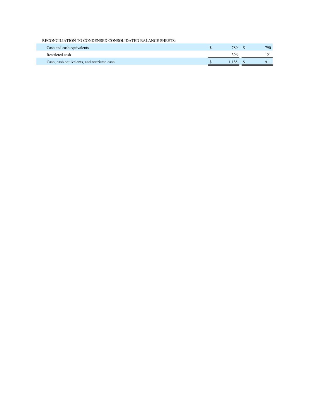 RECONCILIATION TO CONDENSED CONSOLIDATED BALANCE SHEETS: Cash and cash equivalents $ 789 $ 790 Restricted cash 396 121 Cash, cash equivalents, and restricted cash $ 1,185 $ 911