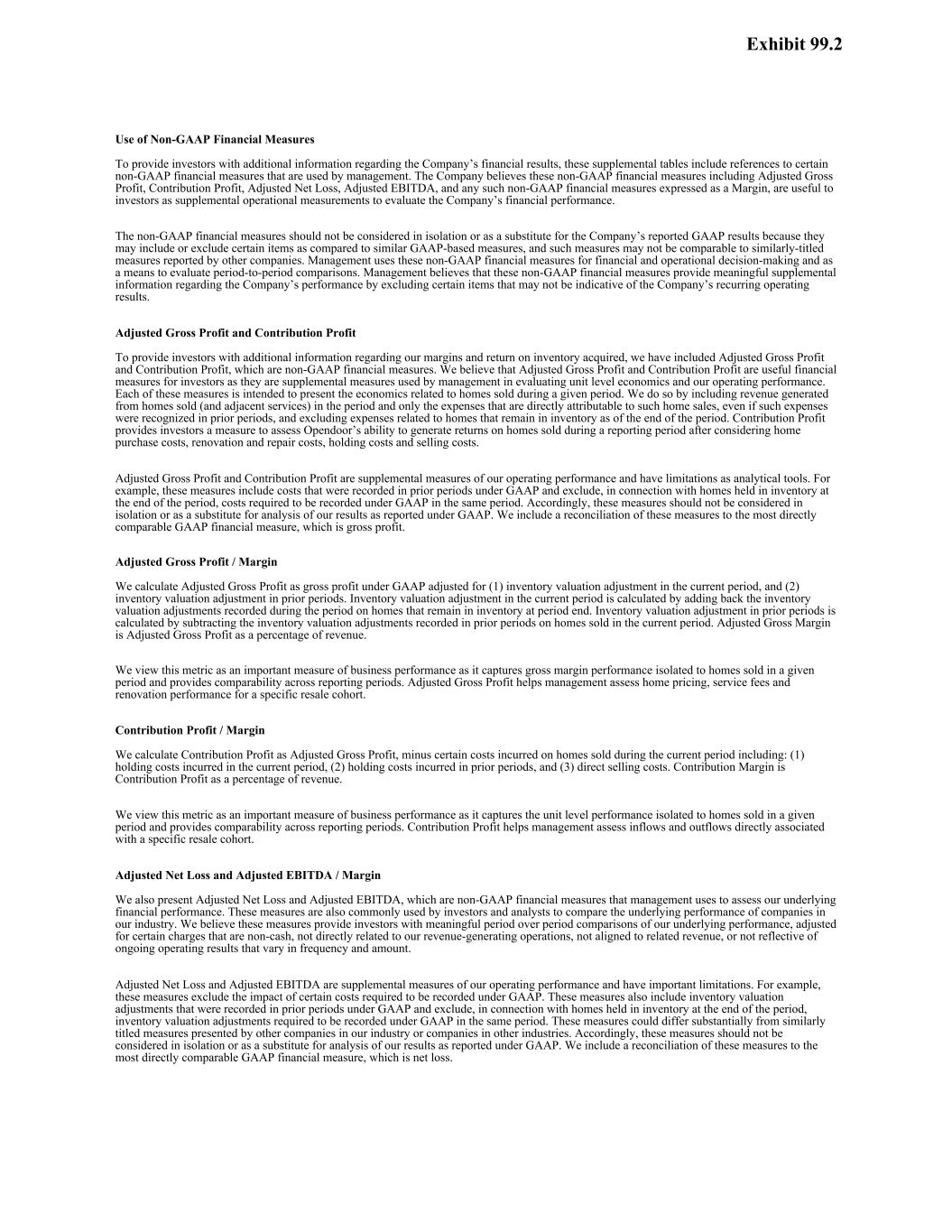Use of Non-GAAP Financial Measures To provide investors with additional information regarding the Company’s financial results, these supplemental tables include references to certain non-GAAP financial measures that are used by management. The Company believes these non-GAAP financial measures including Adjusted Gross Profit, Contribution Profit, Adjusted Net Loss, Adjusted EBITDA, and any such non-GAAP financial measures expressed as a Margin, are useful to investors as supplemental operational measurements to evaluate the Company’s financial performance. The non-GAAP financial measures should not be considered in isolation or as a substitute for the Company’s reported GAAP results because they may include or exclude certain items as compared to similar GAAP-based measures, and such measures may not be comparable to similarly-titled measures reported by other companies. Management uses these non-GAAP financial measures for financial and operational decision-making and as a means to evaluate period-to-period comparisons. Management believes that these non-GAAP financial measures provide meaningful supplemental information regarding the Company’s performance by excluding certain items that may not be indicative of the Company’s recurring operating results. Adjusted Gross Profit and Contribution Profit To provide investors with additional information regarding our margins and return on inventory acquired, we have included Adjusted Gross Profit and Contribution Profit, which are non-GAAP financial measures. We believe that Adjusted Gross Profit and Contribution Profit are useful financial measures for investors as they are supplemental measures used by management in evaluating unit level economics and our operating performance. Each of these measures is intended to present the economics related to homes sold during a given period. We do so by including revenue generated from homes sold (and adjacent services) in the period and only the expenses that are directly attributable to such home sales, even if such expenses were recognized in prior periods, and excluding expenses related to homes that remain in inventory as of the end of the period. Contribution Profit provides investors a measure to assess Opendoor’s ability to generate returns on homes sold during a reporting period after considering home purchase costs, renovation and repair costs, holding costs and selling costs. Adjusted Gross Profit and Contribution Profit are supplemental measures of our operating performance and have limitations as analytical tools. For example, these measures include costs that were recorded in prior periods under GAAP and exclude, in connection with homes held in inventory at the end of the period, costs required to be recorded under GAAP in the same period. Accordingly, these measures should not be considered in isolation or as a substitute for analysis of our results as reported under GAAP. We include a reconciliation of these measures to the most directly comparable GAAP financial measure, which is gross profit. Adjusted Gross Profit / Margin We calculate Adjusted Gross Profit as gross profit under GAAP adjusted for (1) inventory valuation adjustment in the current period, and (2) inventory valuation adjustment in prior periods. Inventory valuation adjustment in the current period is calculated by adding back the inventory valuation adjustments recorded during the period on homes that remain in inventory at period end. Inventory valuation adjustment in prior periods is calculated by subtracting the inventory valuation adjustments recorded in prior periods on homes sold in the current period. Adjusted Gross Margin is Adjusted Gross Profit as a percentage of revenue. We view this metric as an important measure of business performance as it captures gross margin performance isolated to homes sold in a given period and provides comparability across reporting periods. Adjusted Gross Profit helps management assess home pricing, service fees and renovation performance for a specific resale cohort. Contribution Profit / Margin We calculate Contribution Profit as Adjusted Gross Profit, minus certain costs incurred on homes sold during the current period including: (1) holding costs incurred in the current period, (2) holding costs incurred in prior periods, and (3) direct selling costs. Contribution Margin is Contribution Profit as a percentage of revenue. We view this metric as an important measure of business performance as it captures the unit level performance isolated to homes sold in a given period and provides comparability across reporting periods. Contribution Profit helps management assess inflows and outflows directly associated with a specific resale cohort. Adjusted Net Loss and Adjusted EBITDA / Margin We also present Adjusted Net Loss and Adjusted EBITDA, which are non-GAAP financial measures that management uses to assess our underlying financial performance. These measures are also commonly used by investors and analysts to compare the underlying performance of companies in our industry. We believe these measures provide investors with meaningful period over period comparisons of our underlying performance, adjusted for certain charges that are non-cash, not directly related to our revenue-generating operations, not aligned to related revenue, or not reflective of ongoing operating results that vary in frequency and amount. Adjusted Net Loss and Adjusted EBITDA are supplemental measures of our operating performance and have important limitations. For example, these measures exclude the impact of certain costs required to be recorded under GAAP. These measures also include inventory valuation adjustments that were recorded in prior periods under GAAP and exclude, in connection with homes held in inventory at the end of the period, inventory valuation adjustments required to be recorded under GAAP in the same period. These measures could differ substantially from similarly titled meas