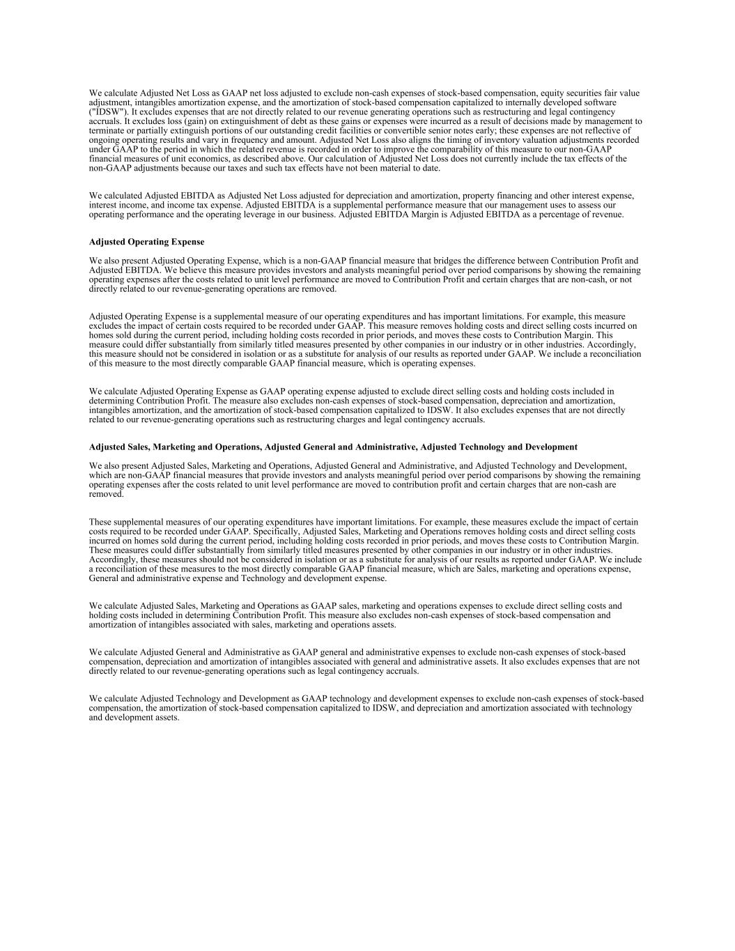 We calculate Adjusted Net Loss as GAAP net loss adjusted to exclude non-cash expenses of stock-based compensation, equity securities fair value adjustment, intangibles amortization expense, and the amortization of stock-based compensation capitalized to internally developed software ("IDSW"). It excludes expenses that are not directly related to our revenue generating operations such as restructuring and legal contingency accruals. It excludes loss (gain) on extinguishment of debt as these gains or expenses were incurred as a result of decisions made by management to terminate or partially extinguish portions of our outstanding credit facilities or convertible senior notes early; these expenses are not reflective of ongoing operating results and vary in frequency and amount. Adjusted Net Loss also aligns the timing of inventory valuation adjustments recorded under GAAP to the period in which the related revenue is recorded in order to improve the comparability of this measure to our non-GAAP financial measures of unit economics, as described above. Our calculation of Adjusted Net Loss does not currently include the tax effects of the non-GAAP adjustments because our taxes and such tax effects have not been material to date. We calculated Adjusted EBITDA as Adjusted Net Loss adjusted for depreciation and amortization, property financing and other interest expense, interest income, and income tax expense. Adjusted EBITDA is a supplemental performance measure that our management uses to assess our operating performance and the operating leverage in our business. Adjusted EBITDA Margin is Adjusted EBITDA as a percentage of revenue. Adjusted Operating Expense We also present Adjusted Operating Expense, which is a non-GAAP financial measure that bridges the difference between Contribution Profit and Adjusted EBITDA. We believe this measure provides investors and analysts meaningful period over period comparisons by showing the remaining operating expenses after the costs related to unit level performance are moved to Contribution Profit and certain charges that are non-cash, or not directly related to our revenue-generating operations are removed. Adjusted Operating Expense is a supplemental measure of our operating expenditures and has important limitations. For example, this measure excludes the impact of certain costs required to be recorded under GAAP. This measure removes holding costs and direct selling costs incurred on homes sold during the current period, including holding costs recorded in prior periods, and moves these costs to Contribution Margin. This measure could differ substantially from similarly titled measures presented by other companies in our industry or in other industries. Accordingly, this measure should not be considered in isolation or as a substitute for analysis of our results as reported under GAAP. We include a reconciliation of this measure to the most directly comparable GAAP financial measure, which is operating expenses. We calculate Adjusted Operating Expense as GAAP operating expense adjusted to exclude direct selling costs and holding costs included in determining Contribution Profit. The measure also excludes non-cash expenses of stock-based compensation, depreciation and amortization, intangibles amortization, and the amortization of stock-based compensation capitalized to IDSW. It also excludes expenses that are not directly related to our revenue-generating operations such as restructuring charges and legal contingency accruals. Adjusted Sales, Marketing and Operations, Adjusted General and Administrative, Adjusted Technology and Development We also present Adjusted Sales, Marketing and Operations, Adjusted General and Administrative, and Adjusted Technology and Development, which are non-GAAP financial measures that provide investors and analysts meaningful period over period comparisons by showing the remaining operating expenses after the costs related to unit level performance are moved to contribution profit and certain charges that are non-cash are removed. These supplemental measures of our operating expenditures have important limitations. For example, these measures exclude the impact of certain costs required to be recorded under GAAP. Specifically, Adjusted Sales, Marketing and Operations removes holding costs and direct selling costs incurred on homes sold during the current period, including holding costs recorded in prior periods, and moves these costs to Contribution Margin. These measures could differ substantially from similarly titled measures presented by other companies in our industry or in other industries. Accordingly, these measures should not be considered in isolation or as a substitute for analysis of our results as reported under GAAP. We include a reconciliation of these measures to the most directly comparable GAAP financial measure, which are Sales, marketing and operations expense, General and administrative expense and Technology and development expense. We calculate Adjusted Sales, Marketing and Operations as GAAP sales, marketing and operations expenses to exclude direct selling costs and holding costs included in determining Contribution Profit. This measure also excludes non-cash expenses of stock-based compensation and amortization of intangibles associated with sales, marketing and operations assets. We calculate Adjusted General and Administrative as GAAP general and administrative expenses to exclude non-cash expenses of stock-based compensation, depreciation and amortization of intangibles associated with general and administrative assets. It also excludes expenses that are not directly related to our revenue-generating operations such as legal contingency accruals. We calculate Adjusted Technology and Development as GAAP technology and development expenses to exclude non-cash expenses of stock-based compensation, the amortization of stock-based compensation capitalized to IDSW, and depreciation and amortizatio