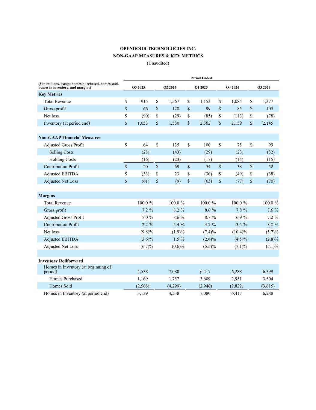 OPENDOOR TECHNOLOGIES INC. NON-GAAP MEASURES & KEY METRICS (Unaudited) Period Ended ($ in millions, except homes purchased, homes sold, homes in inventory, and margins) Q3 2025 Q2 2025 Q1 2025 Q4 2024 Q3 2024 Key Metrics Total Revenue $ 915 $ 1,567 $ 1,153 $ 1,084 $ 1,377 Gross profit $ 66 $ 128 $ 99 $ 85 $ 105 Net loss $ (90) $ (29) $ (85) $ (113) $ (78) Inventory (at period end) $ 1,053 $ 1,530 $ 2,362 $ 2,159 $ 2,145 Non-GAAP Financial Measures Adjusted Gross Profit $ 64 $ 135 $ 100 $ 75 $ 99 Selling Costs (28) (43) (29) (23) (32) Holding Costs (16) (23) (17) (14) (15) Contribution Profit $ 20 $ 69 $ 54 $ 38 $ 52 Adjusted EBITDA $ (33) $ 23 $ (30) $ (49) $ (38) Adjusted Net Loss $ (61) $ (9) $ (63) $ (77) $ (70) Margins Total Revenue 100.0 % 100.0 % 100.0 % 100.0 % 100.0 % Gross profit 7.2 % 8.2 % 8.6 % 7.8 % 7.6 % Adjusted Gross Profit 7.0 % 8.6 % 8.7 % 6.9 % 7.2 % Contribution Profit 2.2 % 4.4 % 4.7 % 3.5 % 3.8 % Net loss (9.8) % (1.9) % (7.4) % (10.4) % (5.7) % Adjusted EBITDA (3.6) % 1.5 % (2.6) % (4.5) % (2.8) % Adjusted Net Loss (6.7) % (0.6) % (5.5) % (7.1) % (5.1) % Inventory Rollforward Homes in Inventory (at beginning of period) 4,538 7,080 6,417 6,288 6,399 Homes Purchased 1,169 1,757 3,609 2,951 3,504 Homes Sold (2,568) (4,299) (2,946) (2,822) (3,615) Homes in Inventory (at period end) 3,139 4,538 7,080 6,417 6,288