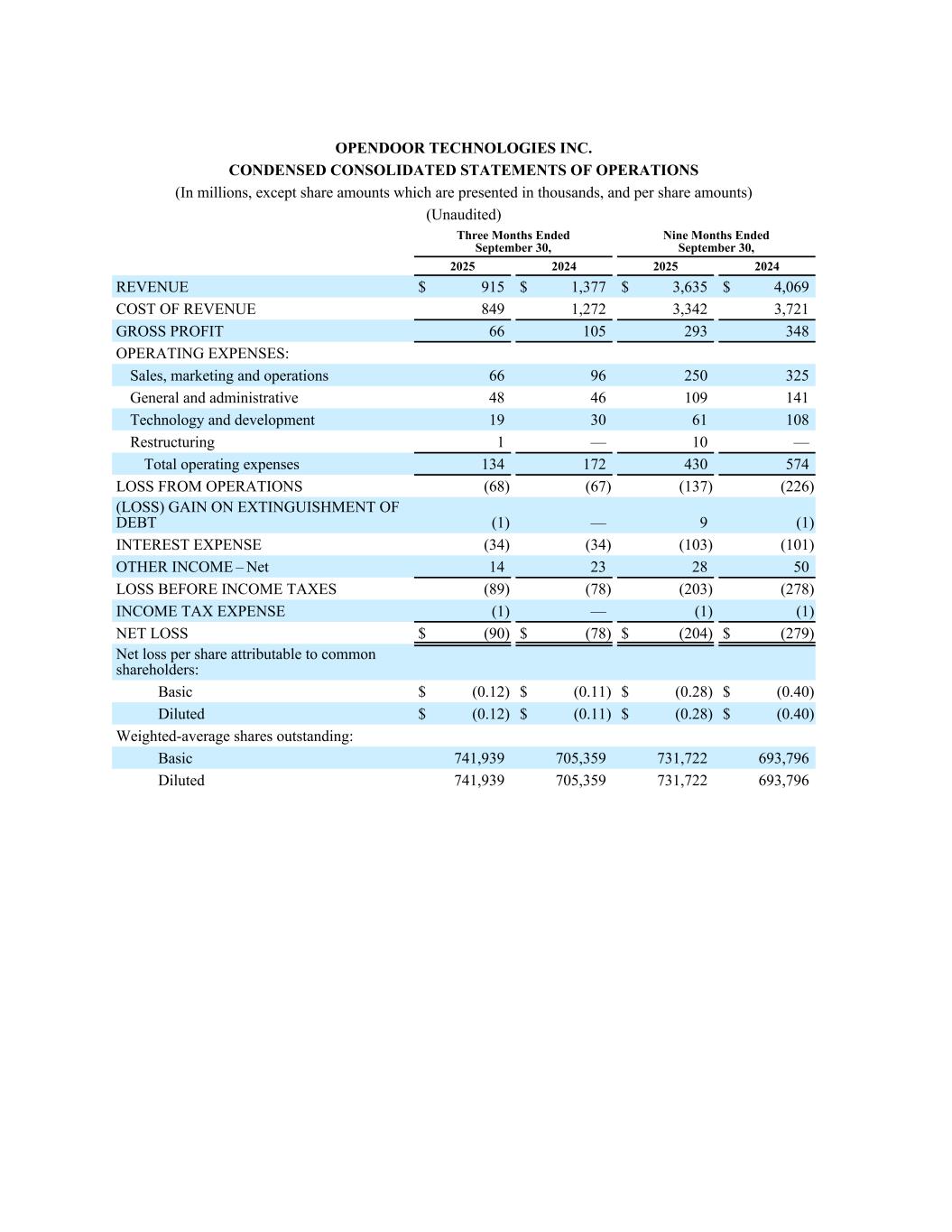 OPENDOOR TECHNOLOGIES INC. CONDENSED CONSOLIDATED STATEMENTS OF OPERATIONS (In millions, except share amounts which are presented in thousands, and per share amounts) (Unaudited) Three Months Ended September 30, Nine Months Ended September 30, 2025 2024 2025 2024 REVENUE $ 915 $ 1,377 $ 3,635 $ 4,069 COST OF REVENUE 849 1,272 3,342 3,721 GROSS PROFIT 66 105 293 348 OPERATING EXPENSES: Sales, marketing and operations 66 96 250 325 General and administrative 48 46 109 141 Technology and development 19 30 61 108 Restructuring 1 — 10 — Total operating expenses 134 172 430 574 LOSS FROM OPERATIONS (68) (67) (137) (226) (LOSS) GAIN ON EXTINGUISHMENT OF DEBT (1) — 9 (1) INTEREST EXPENSE (34) (34) (103) (101) OTHER INCOME – Net 14 23 28 50 LOSS BEFORE INCOME TAXES (89) (78) (203) (278) INCOME TAX EXPENSE (1) — (1) (1) NET LOSS $ (90) $ (78) $ (204) $ (279) Net loss per share attributable to common shareholders: Basic $ (0.12) $ (0.11) $ (0.28) $ (0.40) Diluted $ (0.12) $ (0.11) $ (0.28) $ (0.40) Weighted-average shares outstanding: Basic 741,939 705,359 731,722 693,796 Diluted 741,939 705,359 731,722 693,796