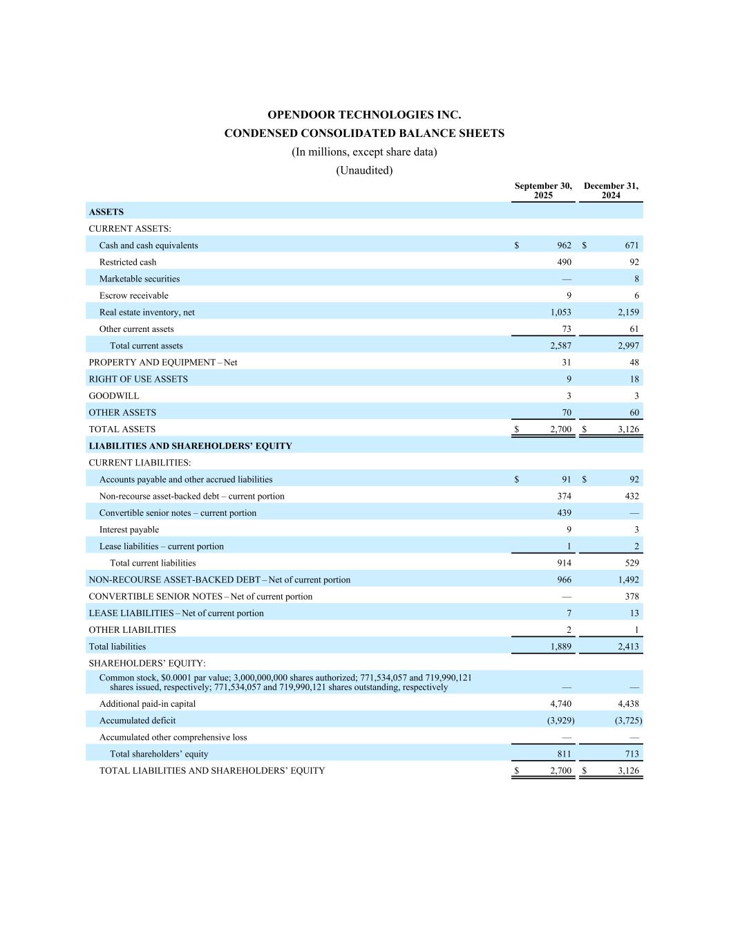OPENDOOR TECHNOLOGIES INC. CONDENSED CONSOLIDATED BALANCE SHEETS (In millions, except share data) (Unaudited) September 30, 2025 December 31, 2024 ASSETS CURRENT ASSETS: Cash and cash equivalents $ 962 $ 671 Restricted cash 490 92 Marketable securities — 8 Escrow receivable 9 6 Real estate inventory, net 1,053 2,159 Other current assets 73 61 Total current assets 2,587 2,997 PROPERTY AND EQUIPMENT – Net 31 48 RIGHT OF USE ASSETS 9 18 GOODWILL 3 3 OTHER ASSETS 70 60 TOTAL ASSETS $ 2,700 $ 3,126 LIABILITIES AND SHAREHOLDERS’ EQUITY CURRENT LIABILITIES: Accounts payable and other accrued liabilities $ 91 $ 92 Non-recourse asset-backed debt – current portion 374 432 Convertible senior notes – current portion 439 — Interest payable 9 3 Lease liabilities – current portion 1 2 Total current liabilities 914 529 NON-RECOURSE ASSET-BACKED DEBT – Net of current portion 966 1,492 CONVERTIBLE SENIOR NOTES – Net of current portion — 378 LEASE LIABILITIES – Net of current portion 7 13 OTHER LIABILITIES 2 1 Total liabilities 1,889 2,413 SHAREHOLDERS’ EQUITY: Common stock, $0.0001 par value; 3,000,000,000 shares authorized; 771,534,057 and 719,990,121 shares issued, respectively; 771,534,057 and 719,990,121 shares outstanding, respectively — — Additional paid-in capital 4,740 4,438 Accumulated deficit (3,929) (3,725) Accumulated other comprehensive loss — — Total shareholders’ equity 811 713 TOTAL LIABILITIES AND SHAREHOLDERS’ EQUITY $ 2,700 $ 3,126