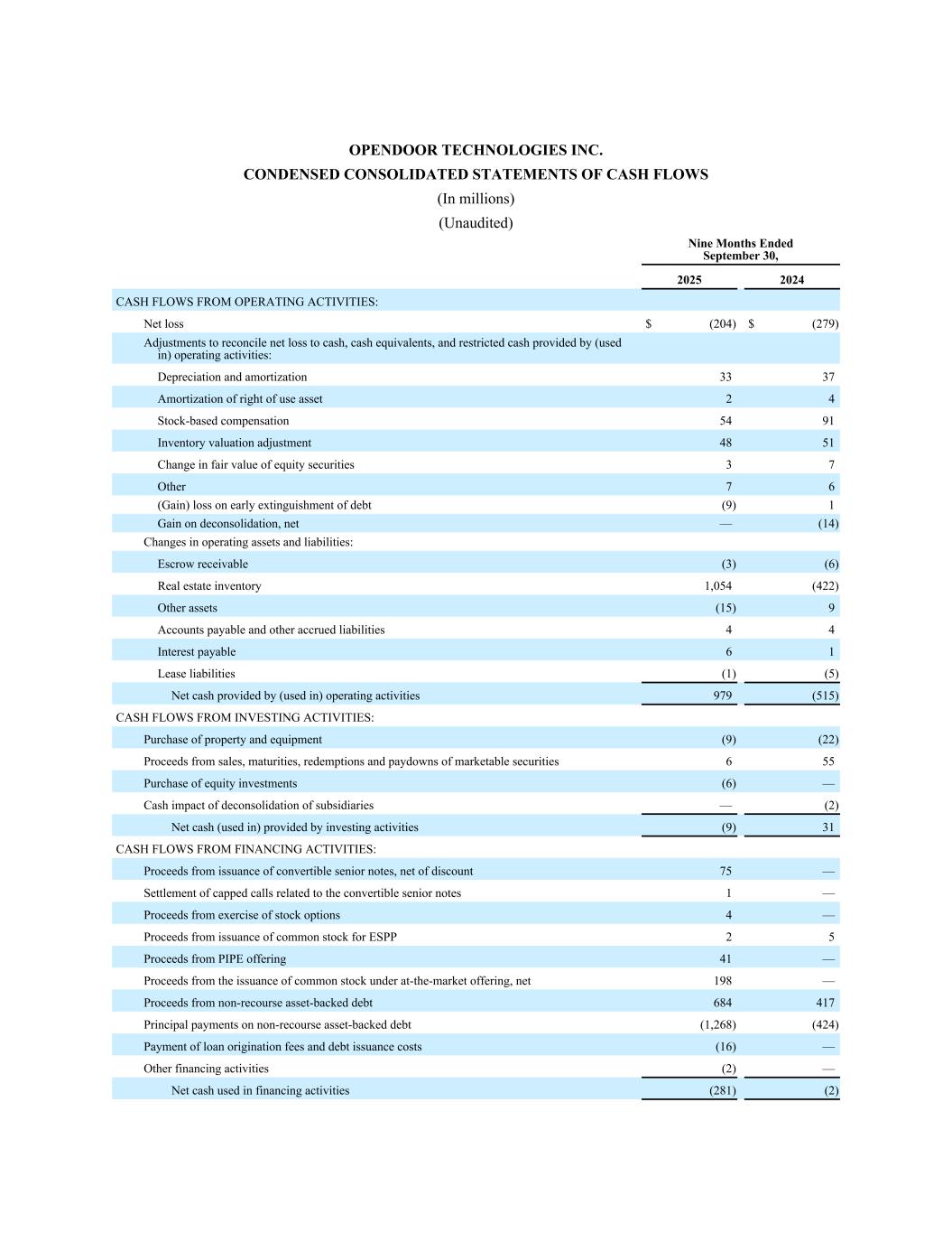 OPENDOOR TECHNOLOGIES INC. CONDENSED CONSOLIDATED STATEMENTS OF CASH FLOWS (In millions) (Unaudited) Nine Months Ended September 30, 2025 2024 CASH FLOWS FROM OPERATING ACTIVITIES: Net loss $ (204) $ (279) Adjustments to reconcile net loss to cash, cash equivalents, and restricted cash provided by (used in) operating activities: Depreciation and amortization 33 37 Amortization of right of use asset 2 4 Stock-based compensation 54 91 Inventory valuation adjustment 48 51 Change in fair value of equity securities 3 7 Other 7 6 (Gain) loss on early extinguishment of debt (9) 1 Gain on deconsolidation, net — (14) Changes in operating assets and liabilities: Escrow receivable (3) (6) Real estate inventory 1,054 (422) Other assets (15) 9 Accounts payable and other accrued liabilities 4 4 Interest payable 6 1 Lease liabilities (1) (5) Net cash provided by (used in) operating activities 979 (515) CASH FLOWS FROM INVESTING ACTIVITIES: Purchase of property and equipment (9) (22) Proceeds from sales, maturities, redemptions and paydowns of marketable securities 6 55 Purchase of equity investments (6) — Cash impact of deconsolidation of subsidiaries — (2) Net cash (used in) provided by investing activities (9) 31 CASH FLOWS FROM FINANCING ACTIVITIES: Proceeds from issuance of convertible senior notes, net of discount 75 — Settlement of capped calls related to the convertible senior notes 1 — Proceeds from exercise of stock options 4 — Proceeds from issuance of common stock for ESPP 2 5 Proceeds from PIPE offering 41 — Proceeds from the issuance of common stock under at-the-market offering, net 198 — Proceeds from non-recourse asset-backed debt 684 417 Principal payments on non-recourse asset-backed debt (1,268) (424) Payment of loan origination fees and debt issuance costs (16) — Other financing activities (2) — Net cash used in financing activities (281) (2)