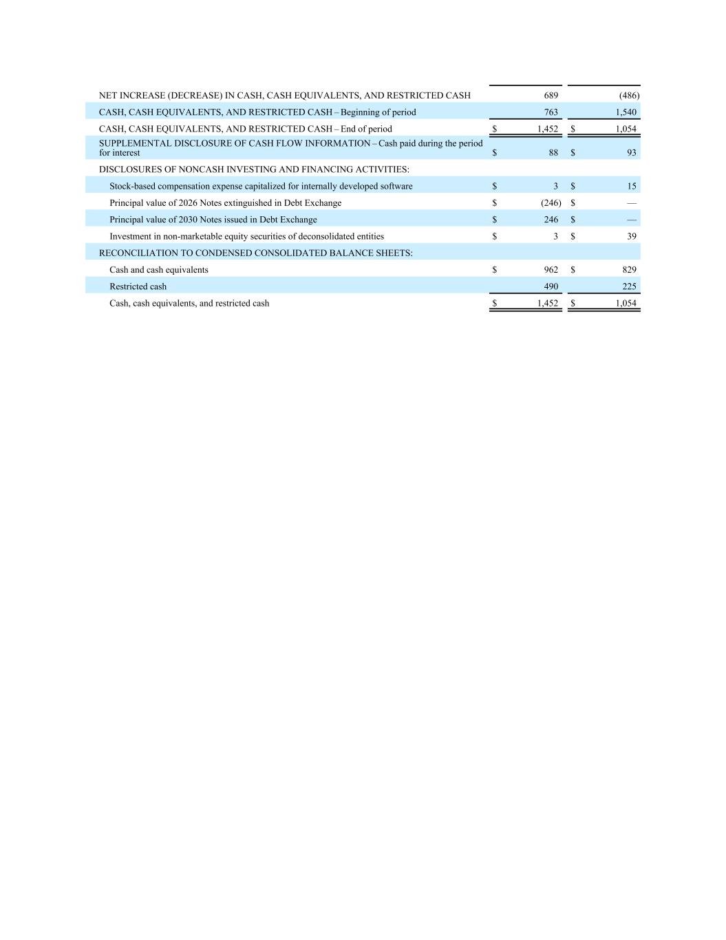 NET INCREASE (DECREASE) IN CASH, CASH EQUIVALENTS, AND RESTRICTED CASH 689 (486) CASH, CASH EQUIVALENTS, AND RESTRICTED CASH – Beginning of period 763 1,540 CASH, CASH EQUIVALENTS, AND RESTRICTED CASH – End of period $ 1,452 $ 1,054 SUPPLEMENTAL DISCLOSURE OF CASH FLOW INFORMATION – Cash paid during the period for interest $ 88 $ 93 DISCLOSURES OF NONCASH INVESTING AND FINANCING ACTIVITIES: Stock-based compensation expense capitalized for internally developed software $ 3 $ 15 Principal value of 2026 Notes extinguished in Debt Exchange $ (246) $ — Principal value of 2030 Notes issued in Debt Exchange $ 246 $ — Investment in non-marketable equity securities of deconsolidated entities $ 3 $ 39 RECONCILIATION TO CONDENSED CONSOLIDATED BALANCE SHEETS: Cash and cash equivalents $ 962 $ 829 Restricted cash 490 225 Cash, cash equivalents, and restricted cash $ 1,452 $ 1,054