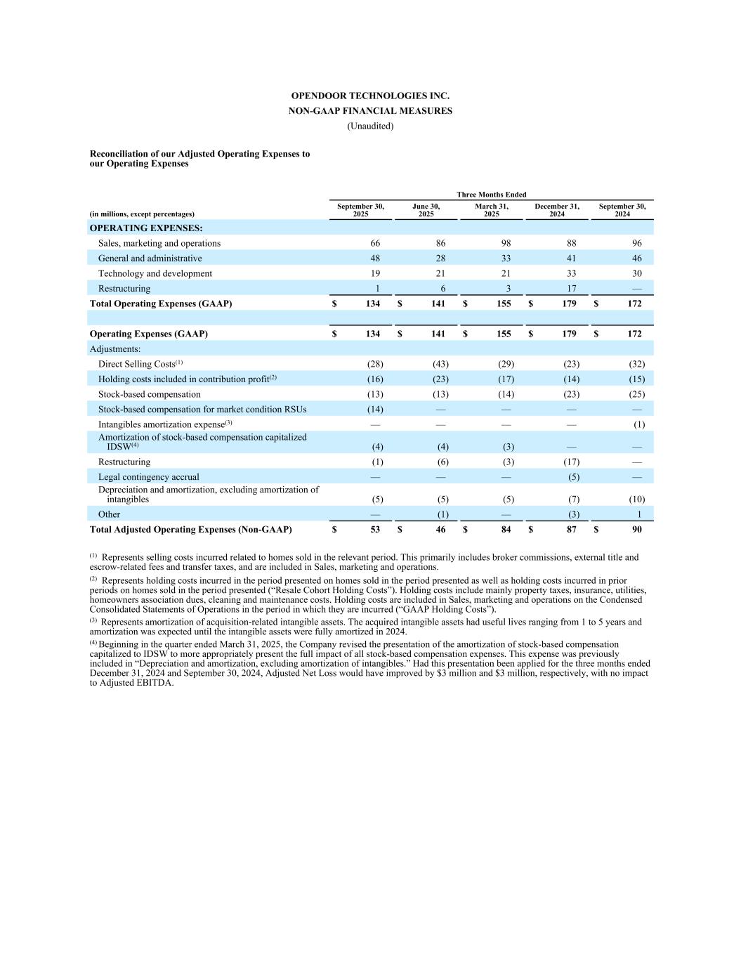OPENDOOR TECHNOLOGIES INC. NON-GAAP FINANCIAL MEASURES (Unaudited) Reconciliation of our Adjusted Operating Expenses to our Operating Expenses Three Months Ended (in millions, except percentages) September 30, 2025 June 30, 2025 March 31, 2025 December 31, 2024 September 30, 2024 OPERATING EXPENSES: Sales, marketing and operations 66 86 98 88 96 General and administrative 48 28 33 41 46 Technology and development 19 21 21 33 30 Restructuring 1 6 3 17 — Total Operating Expenses (GAAP) $ 134 $ 141 $ 155 $ 179 $ 172 Operating Expenses (GAAP) $ 134 $ 141 $ 155 $ 179 $ 172 Adjustments: Direct Selling Costs(1) (28) (43) (29) (23) (32) Holding costs included in contribution profit(2) (16) (23) (17) (14) (15) Stock-based compensation (13) (13) (14) (23) (25) Stock-based compensation for market condition RSUs (14) — — — — Intangibles amortization expense(3) — — — — (1) Amortization of stock-based compensation capitalized IDSW(4) (4) (4) (3) — — Restructuring (1) (6) (3) (17) — Legal contingency accrual — — — (5) — Depreciation and amortization, excluding amortization of intangibles (5) (5) (5) (7) (10) Other — (1) — (3) 1 Total Adjusted Operating Expenses (Non-GAAP) $ 53 $ 46 $ 84 $ 87 $ 90 (1) Represents selling costs incurred related to homes sold in the relevant period. This primarily includes broker commissions, external title and escrow-related fees and transfer taxes, and are included in Sales, marketing and operations. (2) Represents holding costs incurred in the period presented on homes sold in the period presented as well as holding costs incurred in prior periods on homes sold in the period presented (“Resale Cohort Holding Costs”). Holding costs include mainly property taxes, insurance, utilities, homeowners association dues, cleaning and maintenance costs. Holding costs are included in Sales, marketing and operations on the Condensed Consolidated Statements of Operations in the period in which they are incurred (“GAAP Holding Costs”). (3) Represents amortization of acquisition-related intangible assets. The acquired intangible assets had useful lives ranging from 1 to 5 years and amortization was expected until the intangible assets were fully amortized in 2024. (4) Beginning in the quarter ended March 31, 2025, the Company revised the presentation of the amortization of stock-based compensation capitalized to IDSW to more appropriately present the full impact of all stock-based compensation expenses. This expense was previously included in “Depreciation and amortization, excluding amortization of intangibles.” Had this presentation been applied for the three months ended December 31, 2024 and September 30, 2024, Adjusted Net Loss would have improved by $3 million and $3 million, respectively, with no impact to Adjusted EBITDA.