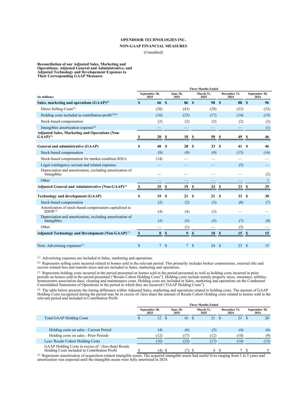 OPENDOOR TECHNOLOGIES INC. NON-GAAP FINANCIAL MEASURES (Unaudited) Reconciliation of our Adjusted Sales, Marketing and Operatiions; Adjusted General and Administrative; and Adjusted Technology and Developement Expenses to Their Corresponding GAAP Measures Three Months Ended (in millions) September 30, 2025 June 30, 2025 March 31, 2025 December 31, 2024 September 30, 2024 Sales, marketing and operations (GAAP)(1) $ 66 $ 86 $ 98 $ 88 $ 96 Direct Selling Costs(2) (28) (43) (29) (23) (32) Holding costs included in contribution profit(3)(4) (16) (23) (17) (14) (15) Stock-based compensation (2) (2) (2) (2) (2) Intangibles amortization expense(5) — — — — (1) Adjusted Sales, Marketing and Operations (Non- GAAP)(6) $ 20 $ 18 $ 50 $ 49 $ 46 General and administrative (GAAP) $ 48 $ 28 $ 33 $ 41 $ 46 Stock-based compensation (9) (9) (9) (13) (16) Stock-based compensation for market condition RSUs (14) — — — — Legal contingency accrual and related expenses — — — (5) — Depreciation and amortization, excluding amortization of intangibles — — — — (2) Other — — — — 1 Adjusted General and Administrative (Non-GAAP)(6) $ 25 $ 19 $ 24 $ 23 $ 29 Technology and development (GAAP) $ 19 $ 21 $ 21 $ 33 $ 30 Stock-based compensation (2) (2) (3) (8) (7) Amortization of stock-based compensation capitalized to IDSW(7) (4) (4) (3) — — Depreciation and amortization, excluding amortization of intangibles (5) (5) (5) (7) (8) Other — (1) — (3) — Adjusted Technology and Development (Non-GAAP)(7) $ 8 $ 9 $ 10 $ 15 $ 15 Note: Advertising expenses(1) $ 7 $ 7 $ 24 $ 23 $ 15 (1) Advertising expenses are included in Sales, marketing and operations. (2) Represents selling costs incurred related to homes sold in the relevant period. This primarily includes broker commissions, external title and escrow-related fees and transfer taxes and are included in Sales, marketing and operations. (3) Represents holding costs incurred in the period presented on homes sold in the period presented as well as holding costs incurred in prior periods on homes sold in the period presented (“Resale Cohort Holding Costs”). Holding costs include mainly property taxes, insurance, utilities, homeowners association dues, cleaning and maintenance costs. Holding costs are included in Sales, marketing and operations on the Condensed Consolidated Statements of Operations in the period in which they are incurred (“GAAP Holding Costs”). (4) The table below presents the timing difference within Adjusted Sales, marketing and operations related to holding costs. The amount of GAAP Holding Costs recognized during the period may be in excess of/ (less than) the amount of Resale Cohort Holding costs related to homes sold in the relevant period and included in Contribution Profit. Three Months Ended September 30, 2025 June 30, 2025 March 31, 2025 December 31, 2024 September 30, 2024 Total GAAP Holding Costs $ 12 $ 16 $ 21 $ 21 $ 20 Holding costs on sales - Current Period (4) (6) (5) (4) (6) Holding costs on sales - Prior Periods (12) (17) (12) (10) (9) Less: Resale Cohort Holding Costs (16) (23) (17) (14) (15) GAAP Holding Costs in excess of / (less than) Resale Holding Costs included in Contribution Profit $ (4) $ (7) $ 4 $ 7 $ 5 (5) Represents amortization of acquisition-related intangible assets. The acquired intangible assets had useful lives ranging from 1 to 5 years and amortization was expected until the intangible assets were fully amortized in 2024.