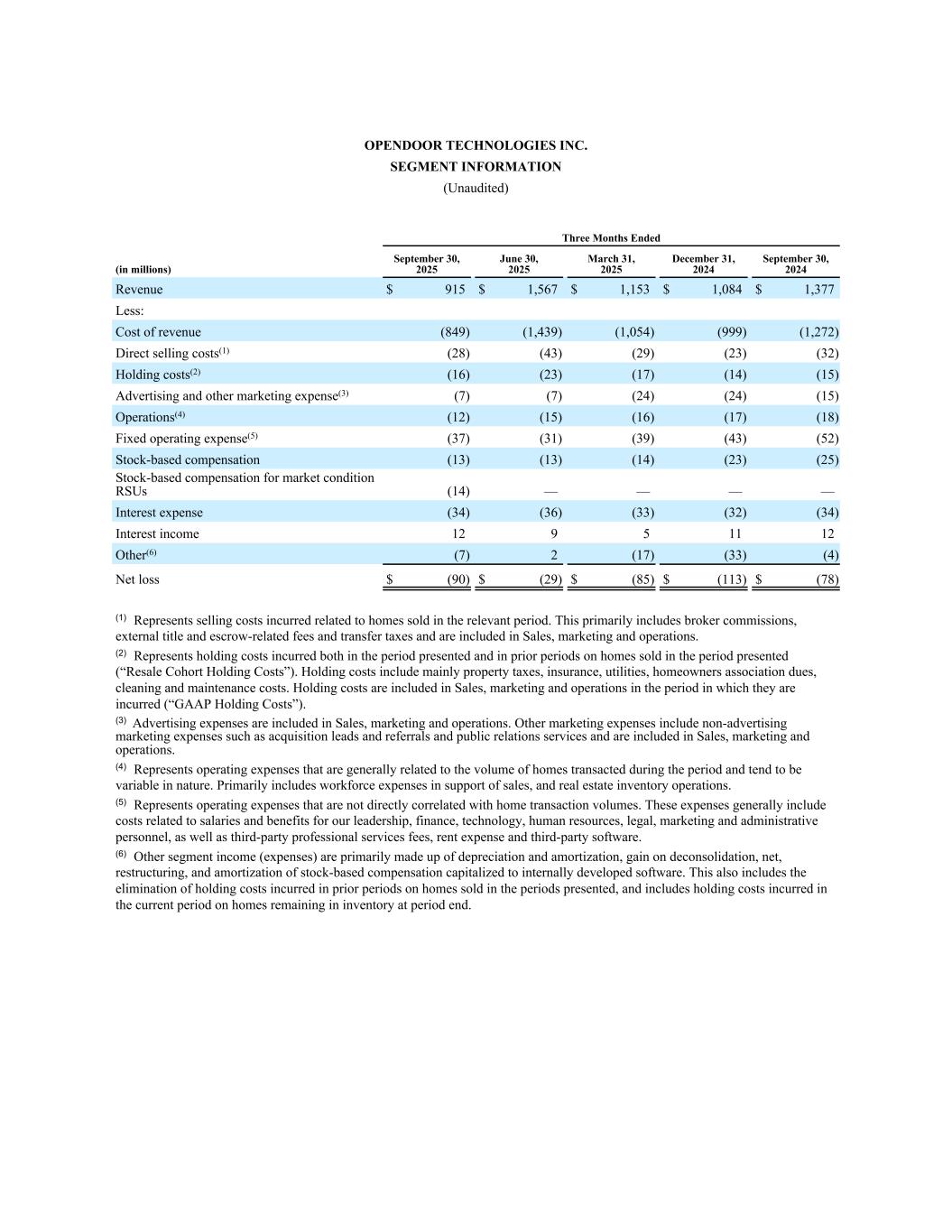 OPENDOOR TECHNOLOGIES INC. SEGMENT INFORMATION (Unaudited) Three Months Ended (in millions) September 30, 2025 June 30, 2025 March 31, 2025 December 31, 2024 September 30, 2024 Revenue $ 915 $ 1,567 $ 1,153 $ 1,084 $ 1,377 Less: Cost of revenue (849) (1,439) (1,054) (999) (1,272) Direct selling costs(1) (28) (43) (29) (23) (32) Holding costs(2) (16) (23) (17) (14) (15) Advertising and other marketing expense(3) (7) (7) (24) (24) (15) Operations(4) (12) (15) (16) (17) (18) Fixed operating expense(5) (37) (31) (39) (43) (52) Stock-based compensation (13) (13) (14) (23) (25) Stock-based compensation for market condition RSUs (14) — — — — Interest expense (34) (36) (33) (32) (34) Interest income 12 9 5 11 12 Other(6) (7) 2 (17) (33) (4) Net loss $ (90) $ (29) $ (85) $ (113) $ (78) (1) Represents selling costs incurred related to homes sold in the relevant period. This primarily includes broker commissions, external title and escrow-related fees and transfer taxes and are included in Sales, marketing and operations. (2) Represents holding costs incurred both in the period presented and in prior periods on homes sold in the period presented (“Resale Cohort Holding Costs”). Holding costs include mainly property taxes, insurance, utilities, homeowners association dues, cleaning and maintenance costs. Holding costs are included in Sales, marketing and operations in the period in which they are incurred (“GAAP Holding Costs”). (3) Advertising expenses are included in Sales, marketing and operations. Other marketing expenses include non-advertising marketing expenses such as acquisition leads and referrals and public relations services and are included in Sales, marketing and operations. (4) Represents operating expenses that are generally related to the volume of homes transacted during the period and tend to be variable in nature. Primarily includes workforce expenses in support of sales, and real estate inventory operations. (5) Represents operating expenses that are not directly correlated with home transaction volumes. These expenses generally include costs related to salaries and benefits for our leadership, finance, technology, human resources, legal, marketing and administrative personnel, as well as third-party professional services fees, rent expense and third-party software. (6) Other segment income (expenses) are primarily made up of depreciation and amortization, gain on deconsolidation, net, restructuring, and amortization of stock-based compensation capitalized to internally developed software. This also includes the elimination of holding costs incurred in prior periods on homes sold in the periods presented, and includes holding costs incurred in the current period on homes remaining in inventory at period end.