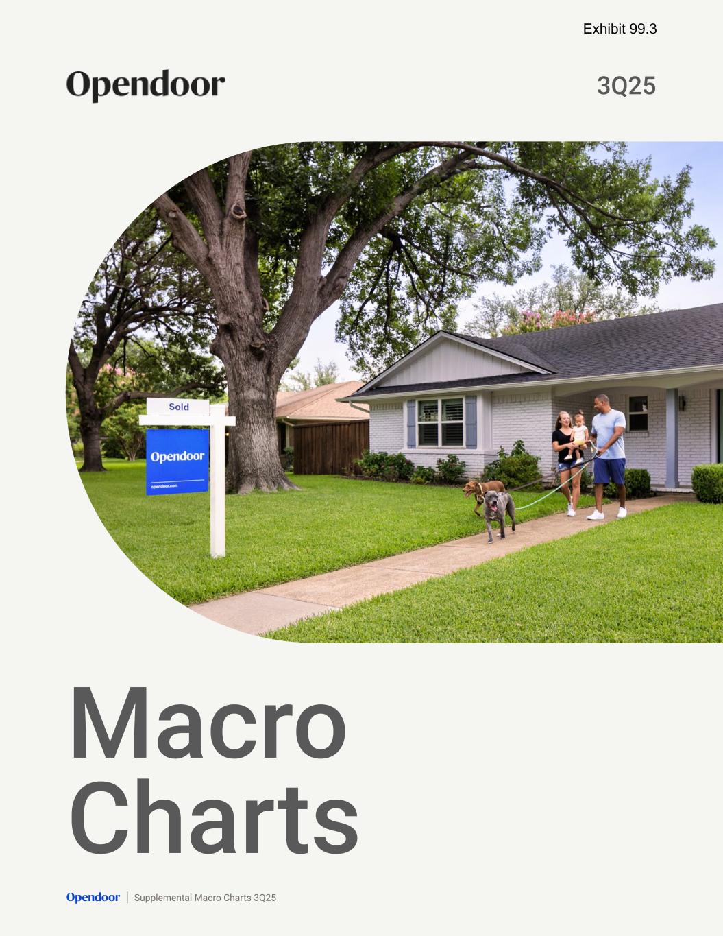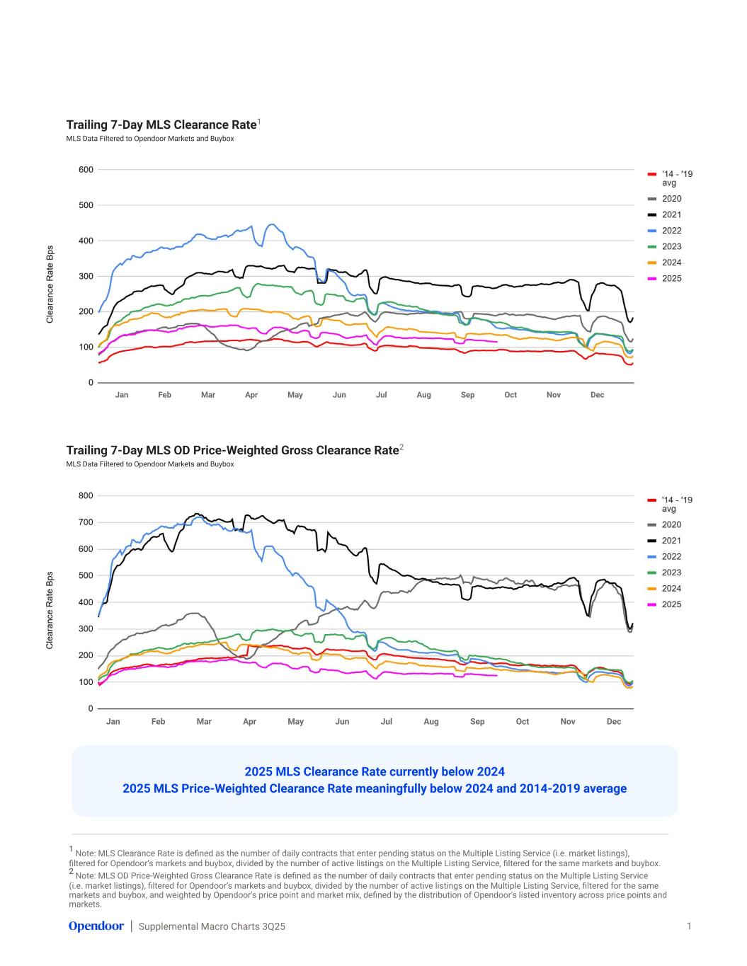 Supplemental Macro Charts 3Q25 1 Note: MLS Clearance Rate is defined as the number of daily contracts that enter pending status on the Multiple Listing Service (i.e. market listings), filtered for Opendoor’s markets and buybox, divided by the number of active listings on the Multiple Listing Service, filtered for the same markets and buybox. 2 Note: MLS OD Price-Weighted Gross Clearance Rate is defined as the number of daily contracts that enter pending status on the Multiple Listing Service (i.e. market listings), filtered for Opendoor’s markets and buybox, divided by the number of active listings on the Multiple Listing Service, filtered for the same markets and buybox, and weighted by Opendoor's price point and market mix, defined by the distribution of Opendoor's listed inventory across price points and markets. Trailing 7-Day MLS Clearance Rate1 MLS Data Filtered to Opendoor Markets and Buybox 1 Jan Feb Mar Apr May Jun Jul Aug Sep Oct Nov Dec 2025 MLS Clearance Rate currently below 2024 2025 MLS Price-Weighted Clearance Rate meaningfully below 2024 and 2014-2019 average Trailing 7-Day MLS OD Price-Weighted Gross Clearance Rate2 MLS Data Filtered to Opendoor Markets and Buybox Jan Feb Mar Apr May Jun Jul Aug Sep Oct Nov Dec