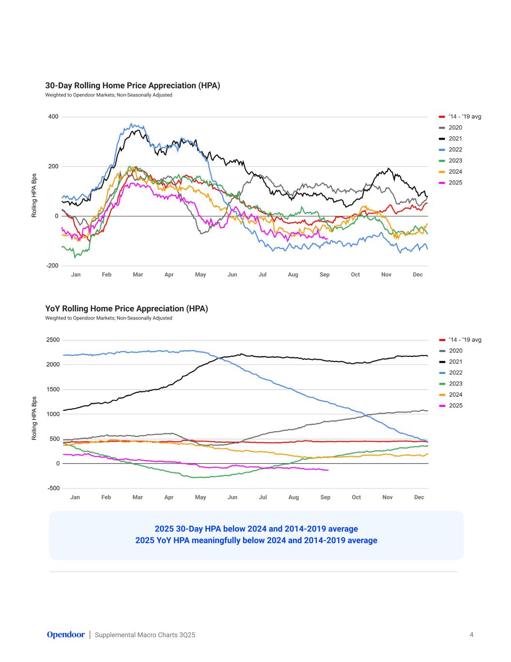 Supplemental Macro Charts 3Q25 30-Day Rolling Home Price Appreciation (HPA) Weighted to Opendoor Markets; Non-Seasonally Adjusted 4 YoY Rolling Home Price Appreciation (HPA) Weighted to Opendoor Markets; Non-Seasonally Adjusted Jan Feb Mar Apr May Jun Jul Aug Sep Oct Nov Dec Jan Feb Mar Apr May Jun Jul Aug Sep Oct Nov Dec 2025 30-Day HPA below 2024 and 2014-2019 average 2025 YoY HPA meaningfully below 2024 and 2014-2019 average